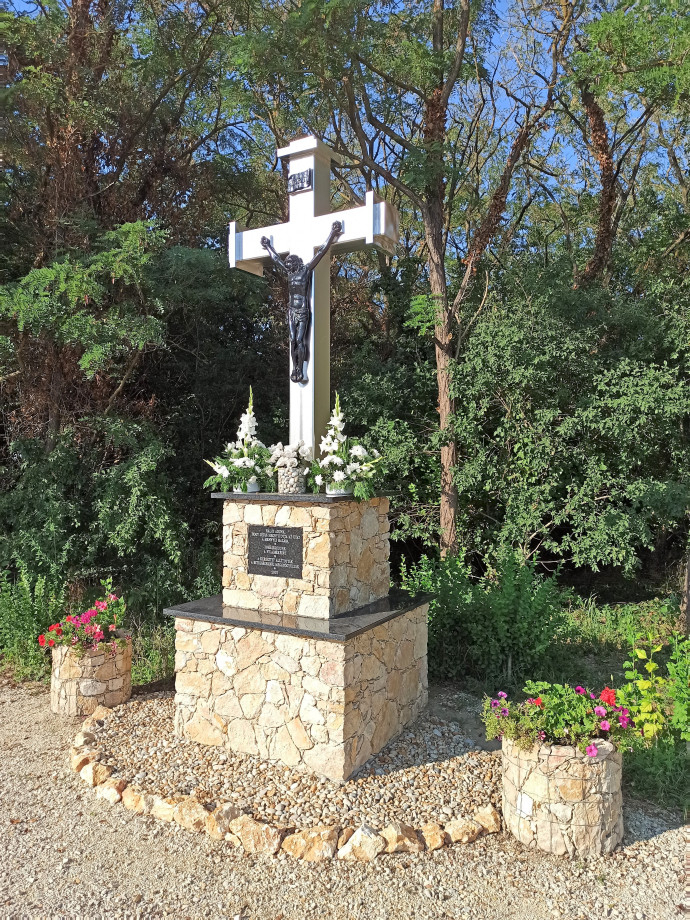 A kereszten ez a felirat áll: „Hálát adunk, hogy Jézus megnyitotta az utat a mennyei hazába. Fohászkodunk a világbékéért. A keresztet állították a betegségekből meggyógyultak. 2022.”