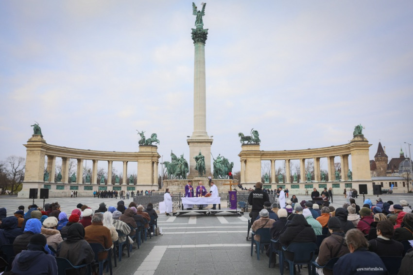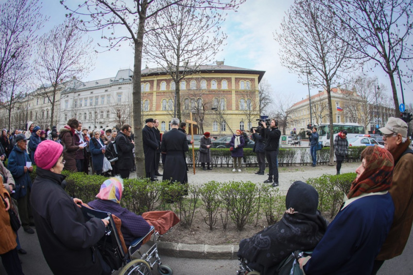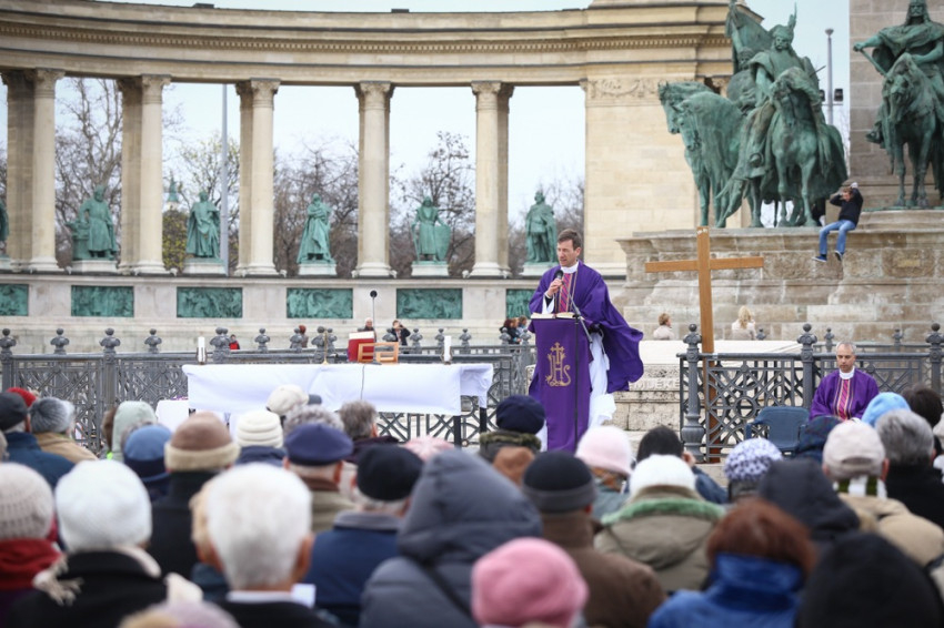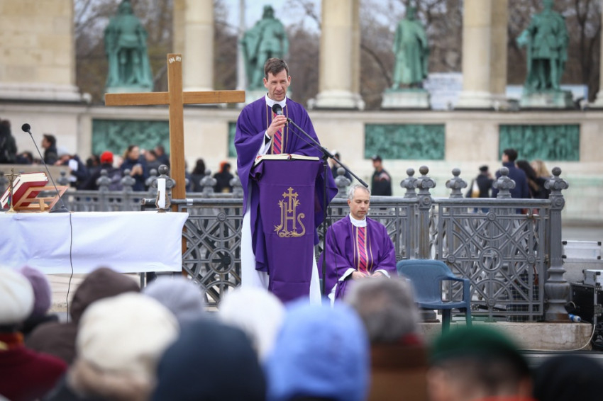 Azért jöttünk ide, hogy keressük Jézust – kezdte szentbeszédét Fejéregyházi Tamás, a Krisztus Légiója Kongregáció elöljárója a Keresztút az életért zarándoklat szentmiséjén. – A zarándoklat mottója egy paradoxont fejez ki: a halálába kísérjük Jézust, de ez az út az élet útja. Jövőt és reményt ad nekünk Jézus, aki az élet istene, akit keresni jöttünk. Az értünk szenvedő Krisztusra emlékezünk, és nem nyugodhatunk meg abban, hogy ezt a golgotát „happy end” zárja.