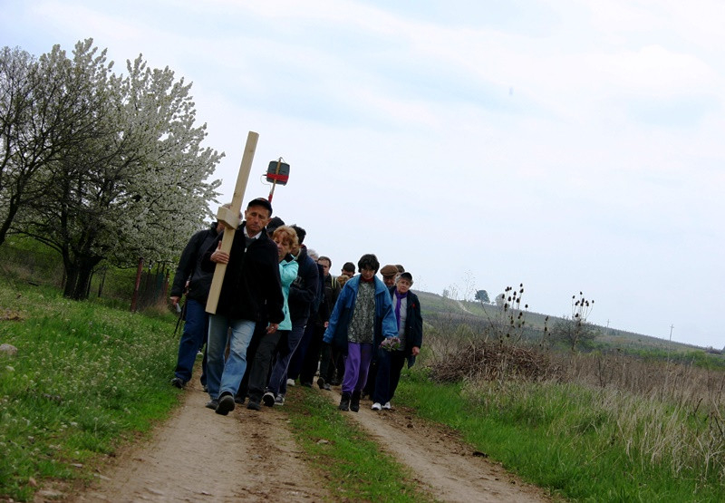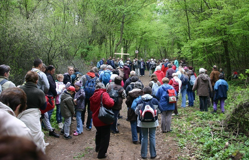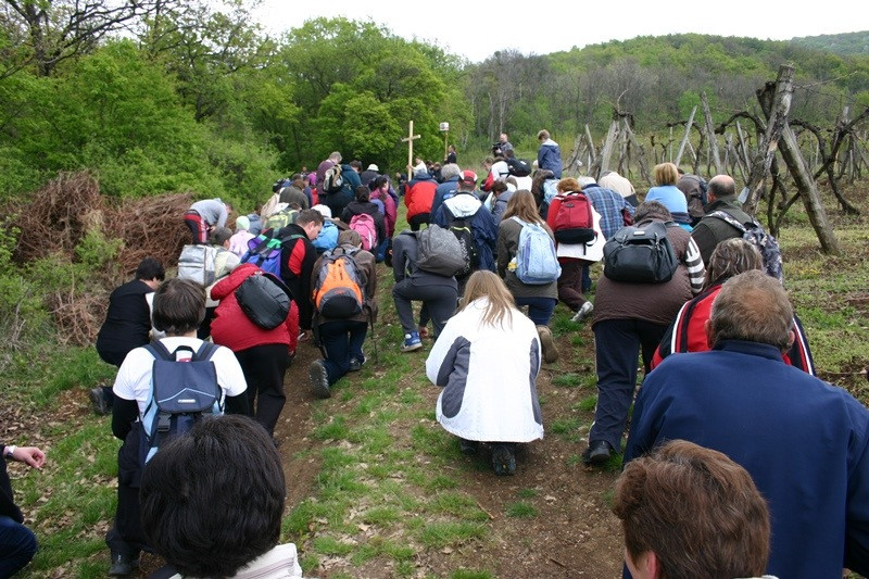 A menet énekelve és imádkozva indult az Eged-hegy irányába. A második állomás már a városon kívüli szőlősdomboknál volt. A keresztutat most a családokért ajánlották fel.