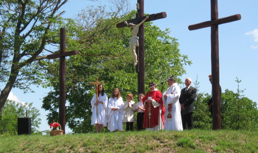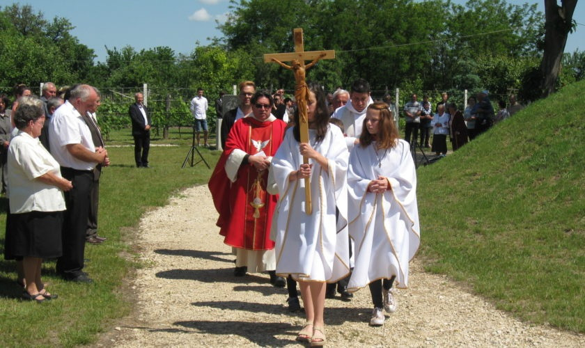 A szentmise után a résztvevők körmenetben vonultak a templomkertben épített keresztúthoz.