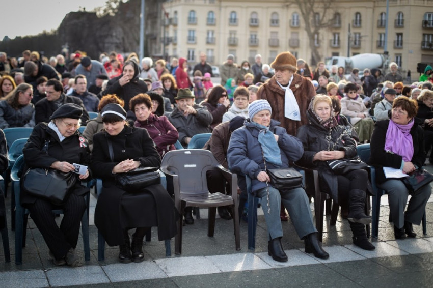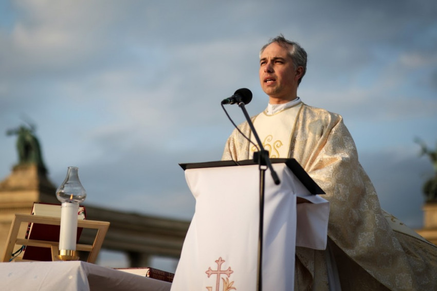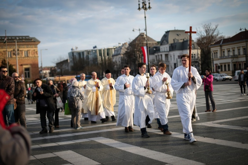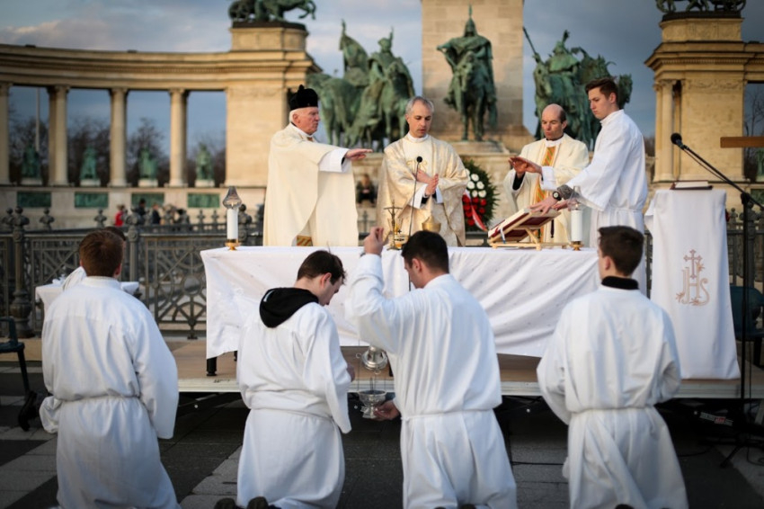 A keresztút résztvevői ezután szabadtéri szentmisén vettek részt a Hősök terén. Szász Csaba, a mise főcelebránsa Szent József ünnepén Jézus nevelőatyját és az ő példáját állította homíliája középpontjába. A Krisztus Légiója szerzetesrend tagja felhívta a figyelmet arra, hogy József sorsa az egyik napról a másikra megváltozott: azt hitte, nemsokára családot alapíthat, békében és örömben élheti az életét Názáret kis városában, ehhez képest azzal kellett szembesülnie, hogy jegyese, Mária valakitől már fogant és gyermeket vár. Már ez is derült égből villámcsapás volt, de ezenkívül meg is jelent neki álmában egy angyal, aki azt mondta, hogy a Szentlélektől származik ez a gyermek, ám Józsefnek kell a gyermeket felnevelnie. Isten belépett József életébe és ez kényelmetlen volt a számára abban a pillanatban, ő azonban nagylelkűen válaszolt Isten ezen kihívására – hangsúlyozta a szónok.