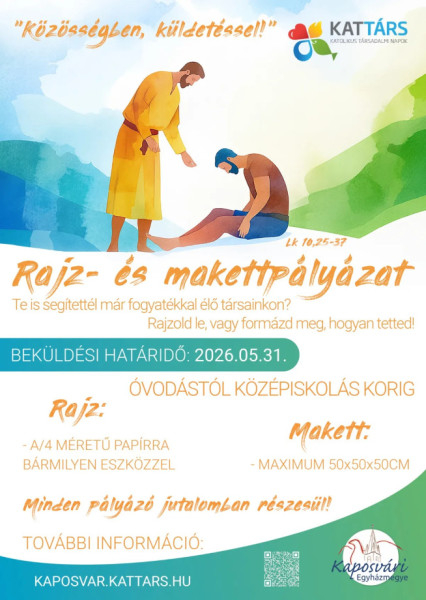 A Kaposvári Egyházmegye Közösségben, küldetéssel! címmel rajz- és makettpályázatot hirdet határokon innen és határokon túl, katolikus hit- és erkölcstanra, katolikus fakultatív hittanra, valamint katolikus egyházi fenntartású intézményekben katolikus hittanra járó óvodásoknak, általános és középiskolás diákoknak.