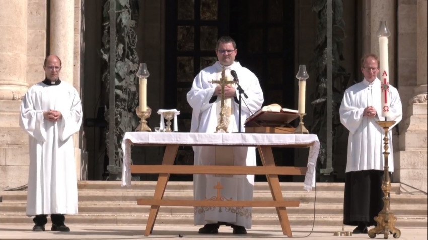 A homília zárásaként egy hasonlatot említett Edvárd atya. „Amikor elvetik a magot, sokáig nem látszik, mi történik vele, majd élet bújik elő a földből. Valami ilyesmit csinált velünk is az Isten. Szeret bennünket, nem hagyott árván. Szentlelke által provokálta hitünket, és ezt teszi most is. Amikor vissza kell mennünk az otthonainkba – hiszen a veszély még nem múlott el, felhőtlen örömre még nincs okunk –, keressük az Atyát a sötétben. Ő Noé bárkájában is ott utazott. Keressük továbbra is az Istent, az ő akaratát, az ő jelenlétét és az ő inspiráló leleményességét fogadjuk meg, tegyük magunkévá.”