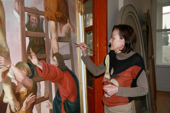 Puskás Éva és Sulyok László restaurátorok befejezték a szatmárnémeti székesegyház Szent István felajánlja a koronát a Szűzanyának című, illetve a máramarosszigeti Borromeo Szent Károly-templom Jézus levétele a keresztről című festményének felújítását. A munkálatok során ezúttal is több érdekességre derült fény. Bebizonyosodott, hogy a székesegyház mellékoltárképéről – valószínűleg a kommunista idők alatt – eltávolították a magyar nemzeti címer színeit, a Szent Koronát és a jogart pedig szinte áttetszővé tették: megpróbálták eltüntetni. Csak színes pontok utaltak rá, hogy a magyar nemzeti címer valaha színezett volt a festményen. A szakemberek elmondták, utána kellett olvasni, dokumentációra volt szükség ahhoz, hogy vissza tudják állítani az említett elemeket eredeti állapotukban. Most ez megtörtént: a címer, a korona és a jogar eredeti színeiben pompázik.