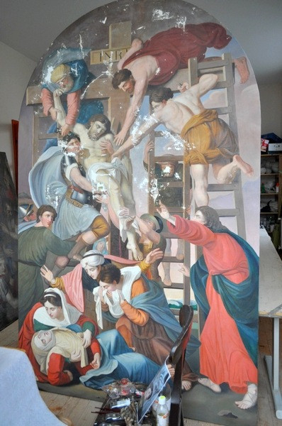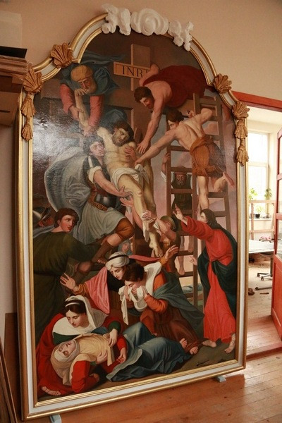 A máramarosszigeti Jézus levétele a keresztről című festmény igazi különlegességnek számít, hiszen ez a gyakran ábrázolt téma itt egy gyönyörű élénk színekben pompázó, tizennégy alakos kompozícióban jelenik meg. A másolat készítője nagyon jól képzett festő lehetett, akinek a nevét még sajnos homály fedi. A festmény korábban a piarista rendház folyosóján volt látható, előképe egy reneszánsz művész, Daniele Ricciarelli da Volterra 1541-ben készült alkotása, annak a másolataként született. Hátulról már foltozva volt a vászon; avatatlan kezek egy egyébként jó minőségű festményt vagdaltak fel, és ennek darabjait ragasztották a hátoldalra. E hozzá nem értő beavatkozás következtében tűnhetett el az egyik szereplő orra is, melynek helyére zöld árnyalatú pótlás került. A kép több helyen hiányos és szakadt, valamint átfestett volt.