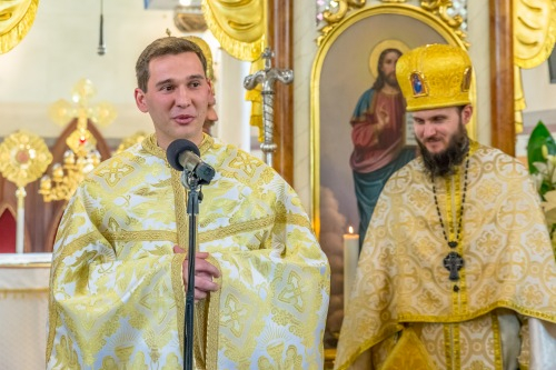 A Szent Liturgia végén Szocska A. Ábel apostoli kormányzó fordult köszöntéssel az újszentelt pap felé, s úgy fogalmazott, hogy a mai embernek szüksége van a vízre, azonban sokkal nagyobb szüksége van a lelki forrásra, arra a lelki italra, amelyet Jézus kínál fel mindannyiunknak. A szenteléssel az Úr valamilyen formában ezt a forrást bízta rá, s neki méltó edénnyé kell válnia, hogy másoknak is továbbadhassa azt.