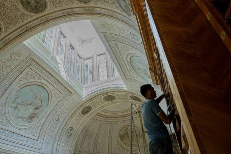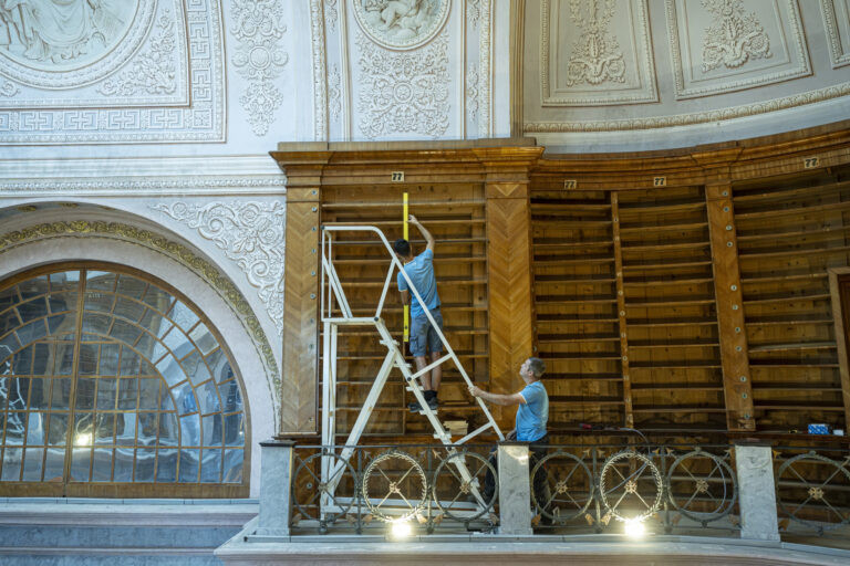 Itt az idő kijavítani, nosza elő a tervrajzokkal! Ám amíg az épület szerkezetéről maradtak fenn eredeti tervek, a belsőépítészeti megoldásokról, a polcrendszerről szinte semmi. Egy kiváló asztalosnak azonban ez nem akkora gond, mert akármilyen hihetetlenül is hangzik, a bútorzatépítési technológiák alig változtak. Eltelt kétszáz év, de a technika nincs annyira távol. Ránéznek, és látják, hogy polcbeakasztásos, fogasléces megoldásokat alkalmaztak, swartnitot és furnérozást, amiket manapság már nem pontosan így használnak, de tisztában vannak a kivitelezésével.