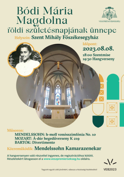 Augusztus 8-án, Bódi Mária Magdolna születése napján a 18 órakor kezdődő, a fiatalon elhunyt vértanú életéért hálát adó ünnepi szentmisét követően a Mendelssohn Kamarazenekar hangversenyét hallgathatják meg az érdeklődők.