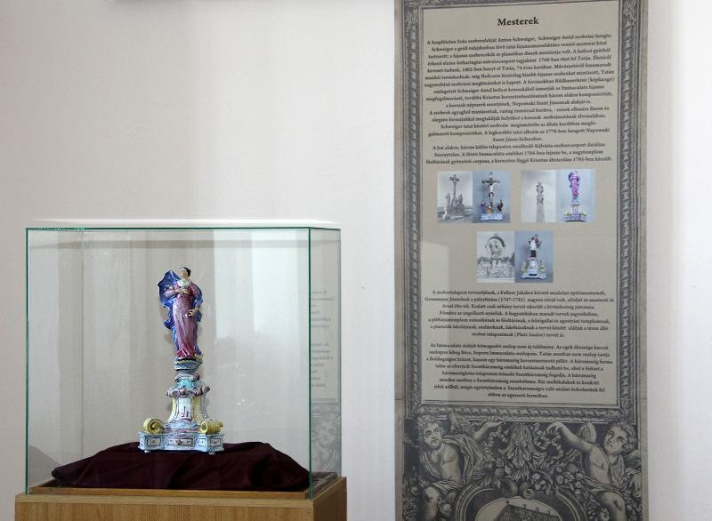 A Szeplőtelen Szűz szoboralakját Schweiger Antal, a tatai fajanszgyár mintázómestere, kisebb fajansz szobrok és a tatai nagyméretű köztéri alkotások szobrásza faragta. A kiállítás különleges kincse Schweiger ónmázas fajanszból készült Immaculata szobra, a tatai Immaculata-oszlop témájának első, kisebb méretben megvalósított megfogalmazása.