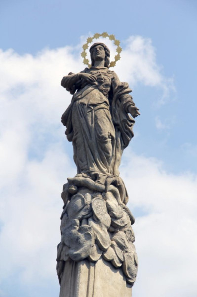 A szobor az egek magasságába emelt Boldogságos Szüzet a Szeplőtelen Fogantatás ikonográfiai sémája szerint ábrázolja – ő a legfőbb védelmező, a legerősebb bajelhárító, és alakja itt, a tatai főtéren a város védőszentjét testesíti meg. A 17–18. században megújuló Mária-tisztelet a Habsburg birodalom területén leggyakrabban az Immaculata típusában öltött testet, és a nap, hold és csillagok díszletei között megjelenő, törékeny Boldogasszonyt népszerűsítette, talán azért is, mert a török időkben (amikor csodák sora igazolta, hogy a keresztény seregeket Mária segíti a győzelemre) a Mária lába alatti holdsarló külön jelentéssel bírt.