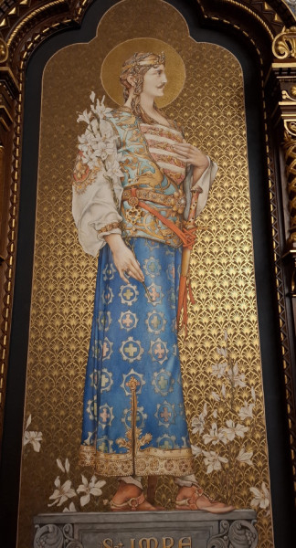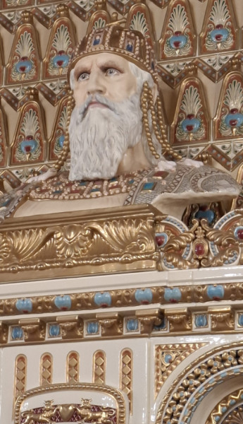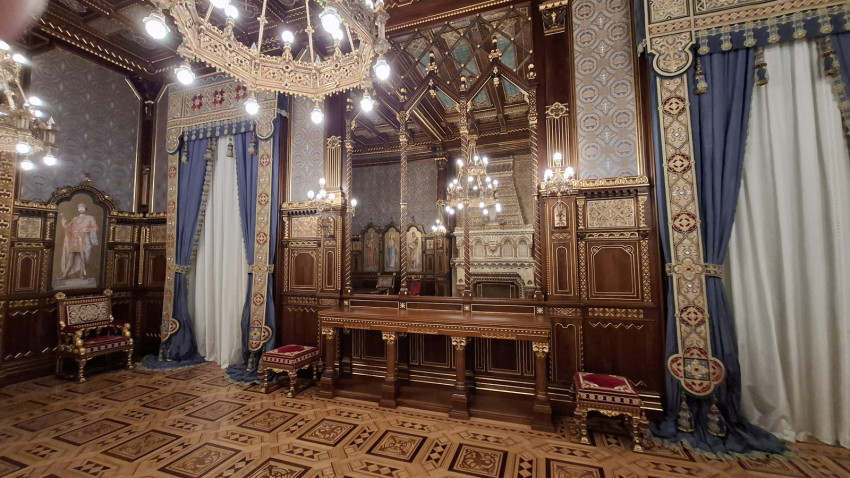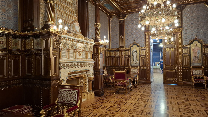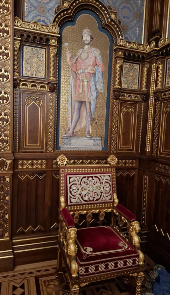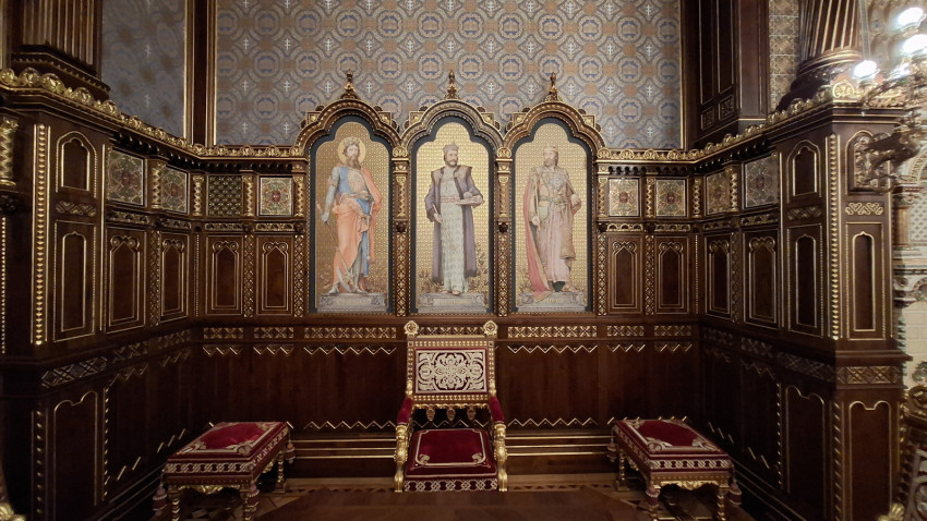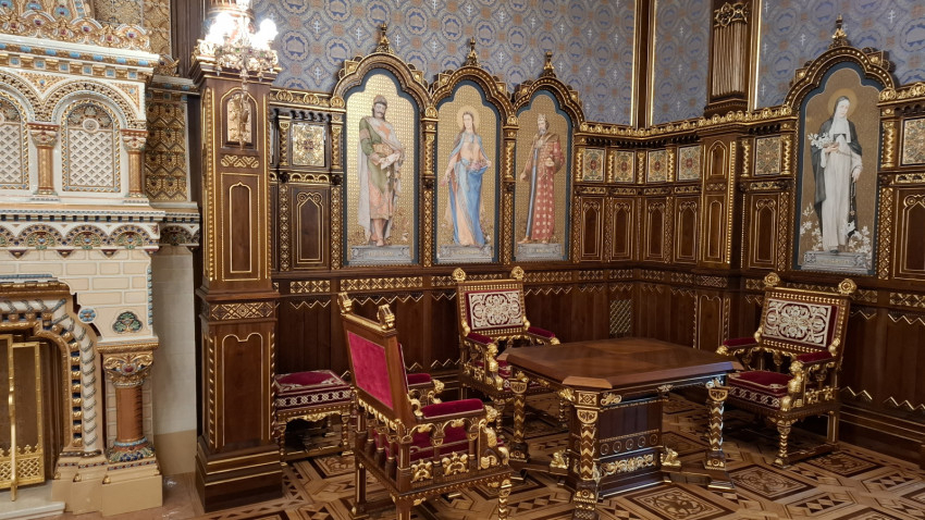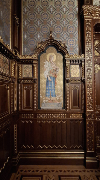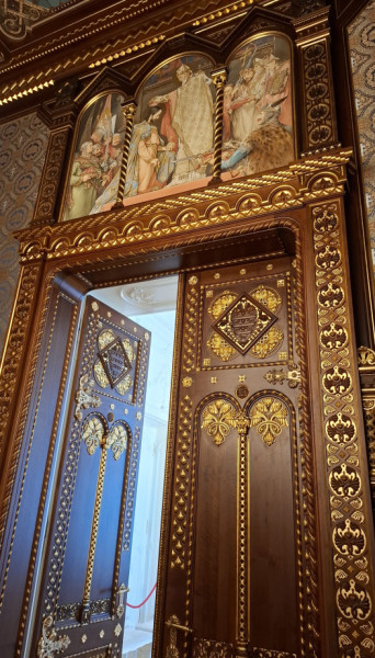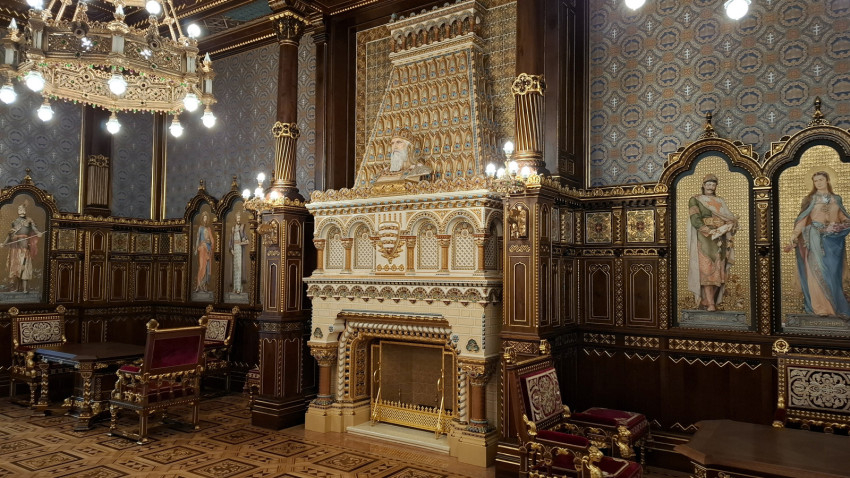 Minket azonban most elsősorban a Szent István-terem érdekel. Bár a várpalota 1945-ben elpusztult, szerencsére a belső berendezésről is maradtak fekete-fehér fényképek. Ezek alapján tudni lehet, hogyan is nézett ki a hatalmas kandallós, díszes terem, ami országalapító királyunk, Szent István tiszteletére készült. A rekonstrukció során a tervezőknek és a kivitelezőknek nagy kihívást jelenthetett ez a sokoldalú munka. Nyilván voltak a teremben olyan elemek, részletek, amelyekről nem maradt fenn fénykép, ezeket ki kellett találni és nem kis fantáziával korhűen elkészíteni.