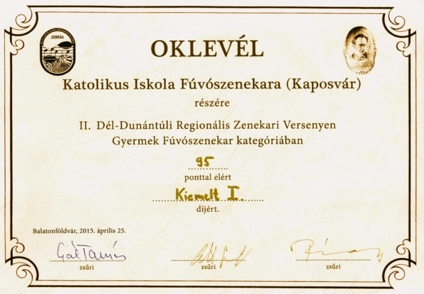 A kaposvári Nagyboldogasszony Római Katolikus Gimnázium, Általános Iskola és Alapfokú Művészeti Iskola Fúvószenekara Bogáthy Gábor karnagy vezetésével kiemelt első díjat ért el a versenyen, ami a zeneiskola tanárai áldozatos és kitartó munkájának is köszönhető. A maximális 100 pontból 95 pontot teljesítettek a kiváló zenekari hangzásnak és létszámuk emelkedésének köszönhetően. A diákok remekül együttműködtek a karnaggyal, amit az értékelésnél a zsűri is kiemelt. Különdíjat kapott Bogáthy Benedek virtuóz xilofonszólójáért.