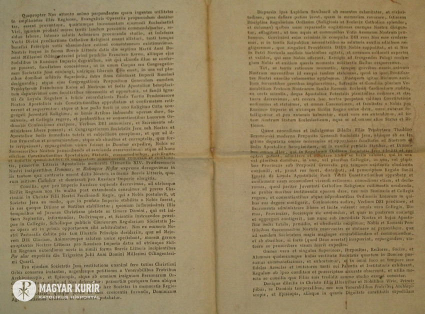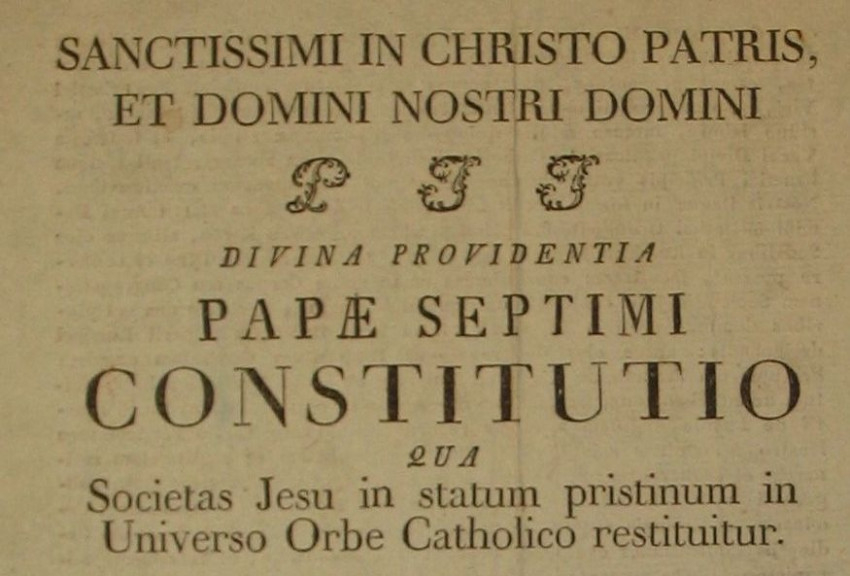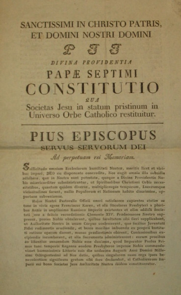 A magyarországi jezsuita provincia levéltárában a rend 1814. évi újjáindulásához kapcsolódó dokumentum bukkant elő. A VII. Pius által kiadott, a rendi működést újra engedélyező Sollicitudo omnium ecclesiarum kezdetű pápai bulla egy 1814/15 fordulóján, a fehéroroszországi Połock jezsuita akadémiáján nyomtatott példánya került elő Szittyay Dénes rendtörténész hagyatékából.