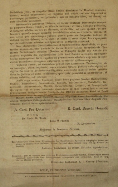 A nyomtatvány külön érdekessége, hogy azt a połocki jezsuita akadémia nyomdájában készítették. Połock (ma По́лацк, Fehéroroszország) ugyanis az 1773. évi feloszlatást követően a jezsuita rend központja lett, mivel II. Katalin orosz cárnő nem volt hajlandó betiltani a rend működését az Orosz Birodalom területén. A világ minden tájáról az itteni jezsuita akadémiára menekülő rendtagoknak köszönhetően az intézmény hihetetlen fejlődésnek indult, és kulturális-tudományos központtá is vált. Az Orosz Birodalom területéről 1820-ban, alig hat évvel a rend újjáindulását követően II. Katalin unokája, I. Sándor cár üldözte el a rendtagokat. Ám ez a hat év elegendő volt arra, hogy Európában a rend újjászerveződése megkezdődjék.