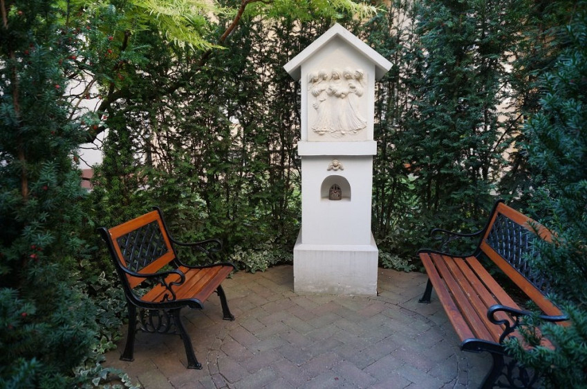 A Boldogasszony Iskolanővérek kertje nyolc évvel ezelőtt Bárkányi M. Krisztella nővér jóvoltából, Tasnádiné Geiger Nóra okleveles tájépítészmérnök tervei alapján jött létre. A benne található plasztika Petrás Mária Prima Primissima és Magyar Örökség díjas keramikus és népdalénekes alkotása, amely a Szűzanyát ábrázolja a kis Jézussal és az őt körülvevő asszonyokkal.