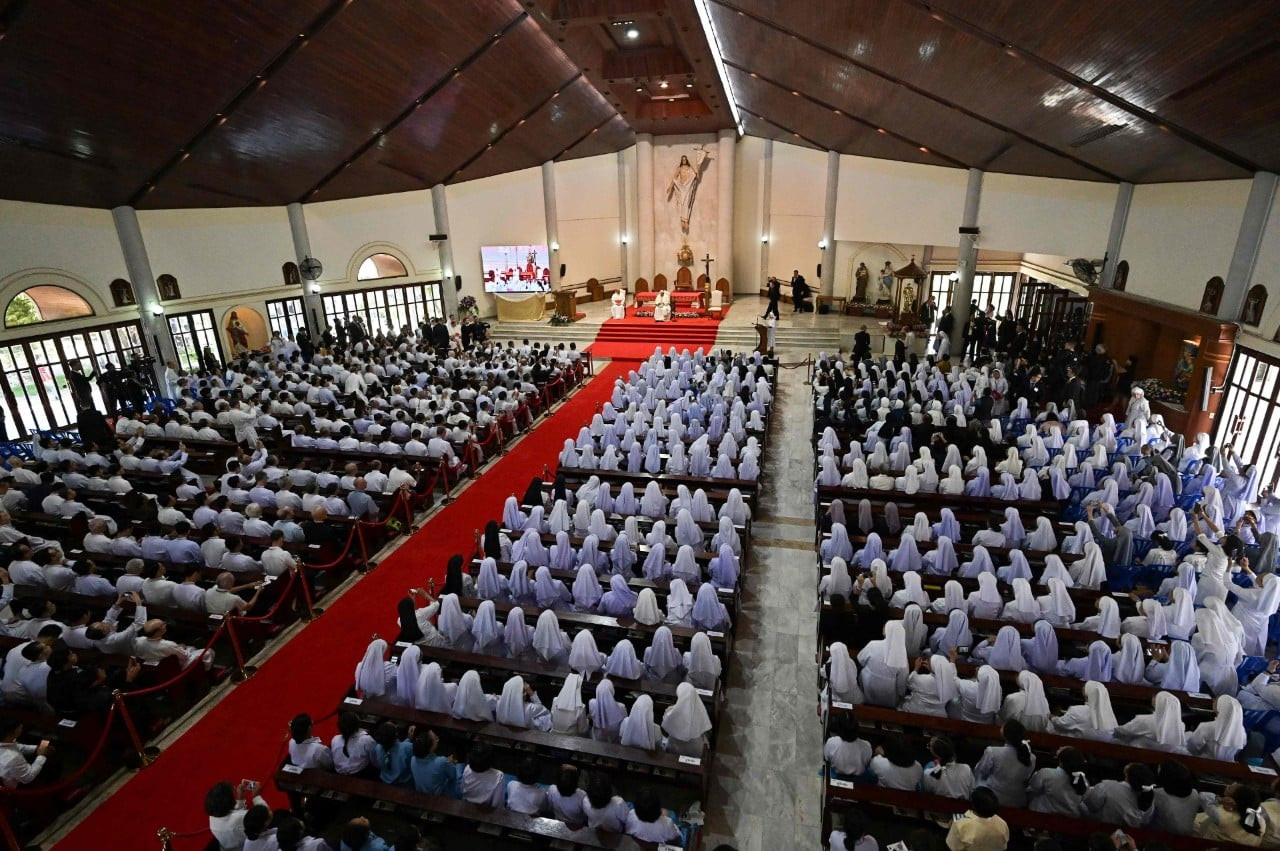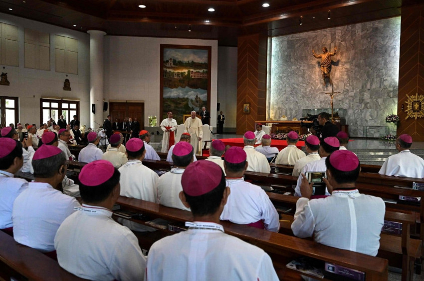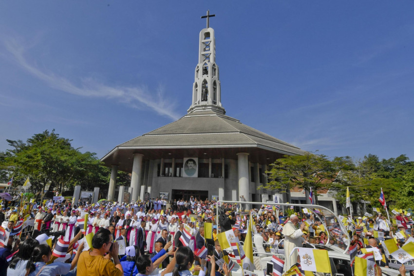 November 22-én a Szent Péter-templom plébánosa fogadta Ferenc pápát a bejáratnál. A szentélyben egy pap, egy szerzetesnővér, egy szeminarista és egy katekéta virágokat nyújtottak át, amit a pápa Szent Péter kegyszobra előtt helyezett el, majd az Oltáriszentség elé járult. Rövid csöndes ima után fogadta Joseph Pradhan Sridarunsil SDB püspök köszöntését, aki rövid beszédében rámutatott: az Egyház szolgálatában álló emberek a kihívásokra – így a családokat gyengítő válság, az idősödő társadalom és a hivatások számának csökkenése – válaszolva odaadóan tevékenykednek az oktatás, a szeretetszolgálat és az emberi méltóság előmozdítása terén. A pápa beszéde előtt Benedetta Jongrak Donoran, a Xavéri Szent Ferenc Nővérei rend posztulánsa tett tanúságot. Benedetta nővér korábban buddhista volt; 2012-ben vette fel a keresztséget.
