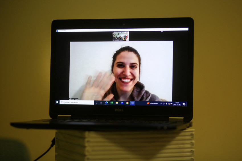 Morva Emília a húsz kisgyereknek elsőként bemutatta Király Esztert, a szerzőt, aki monitorról mosolygott és integetett, mert betegsége miatt személyesen nem tudott jelen lenni, de online bejelentkezett.