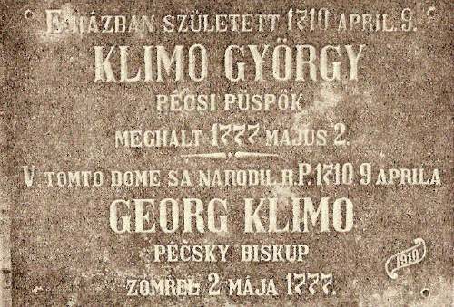 Házukat a hagyomány Klimovecnek, azaz Klimo-háznak nevezte, büszkén gondolva annak korábbi lakójára. 1911 óta ezt az épületen is olvashatjuk: Jedlicska Pál esztergomi kanonok, nagyszombati érseki helytartó, helytörténész kezdeményezésére Klimo szülőházán kétnyelvű (magyar és szlovák) emléktáblát avattak. Jedlicska az elkövetkezendő időkre is gondolt: létrehozott egy 70 forintos alapítványt, hogy a táblát fenntarthassák, valamint hogy az aranyozott vésett betűket időnként felújíthassák. Hogy a 70 forint meddig tarthatott ki, nem tudjuk, az épületet viszont valamikor a 20. század második harmadában lebontották. Az emléktáblát az 1970-es években a lopassói templom padlásán találta meg Bárdi Ilona, a Pécsi Egyetemi Könyvtár munkatársa, aki épp a klimói hagyaték után kutatott. Ekkor készült az utolsó fénykép róla, amelyet Fényes Miklós 1974-ben a pécsi püspöki könyvtárról szóló jubileumi kiadványban közölt is.