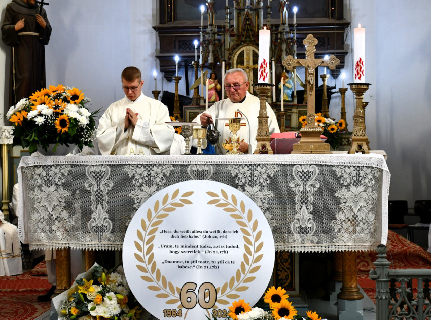 „Készen állunk az ünneplésre! Mindenkit örömmel várunk!” – jelent meg a meghívó május 25-én, szombaton a csáki plébánia közösségi oldalán, a feltöltött képeken és rövid videókon pedig egy ünneplőbe öltöztetett, a Szentszék zászlajának fehér-sárga színeiben pompázó, nyári virágokkal díszített templom volt látható. A főoltár előtt nagy méretű, kerek évfordulós lapon a 60-as szám és egy szentírási idézet volt olvasható: „Uram, te mindent tudsz, azt is tudod, hogy szeretlek.” (Jn 21,17b)