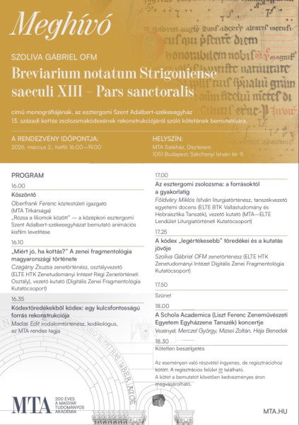 Az ELTE-HTK Zenetudományi Intézet Régi Zenetörténeti Osztálya és az MTA-ELTE Lendület Digitális Zenei Fragmentológia Kutatócsoportja decemberben adta hírül, hogy megjelent Szoliva Gábriel OFM monográfiája, az esztergomi Szent Adalbert-székesegyház 13. századi kottás breviáriuma (Breviarium notatum Strigoniense) második, szanktorále-kötetének rekonstrukciója. A kiadvány a gregorián forráskutatás és a hazai zenei fragmentológia egyik jelentős eredménye.
