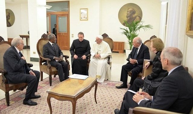 A pápai audienciát követően Kofi Annan a Vatikáni Rádiónak elmondta: „Fontos volt számunkra ez a látogatás, mert sok közös értékben osztozunk a pápával, és szerettünk volna találkozni vele, beszélni az együttműködés lehetőségeiről, továbbá arról, hogy erőfeszítéseinket miként összpontosíthatnánk egyes kérdésekre.” Szó volt a menekültekről és az elvándorlásról, a nukleáris leszerelésről, amelyről a Vatikánban pénteken kezdődik egy csúcstalálkozó. A pápai kihallgatáson érintették a béke és a konfliktuskezelés témáját is. „Mary Robinson beszámol majd a nőkkel kapcsolatos megbeszélésről és annak fontosságáról, hogy hangot adjunk nekik, és tiszteletben tartsuk szerepüket. Remélem, hogy a számos találkozó közül az első éppen erről szól majd” – hangsúlyozta a ghánai diplomata.