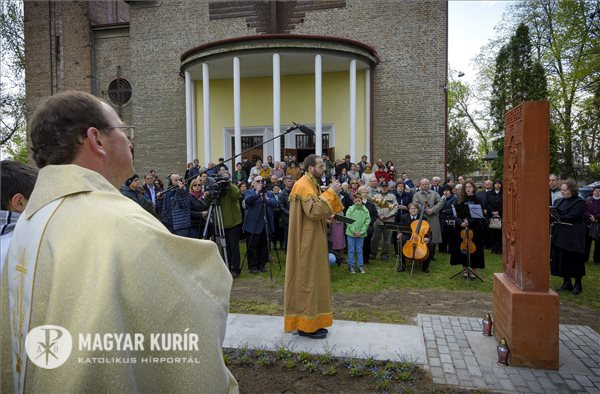 A liturgia után a hívek a plébánia udvarán, a Szent István-szoborral szemben elhelyezett kőkereszthez vonultak, melyet Örményországban készítettek. A kereszt megáldása után Varga Félix, a Magyarországi Örmény Apostoli Egyház lelkésze halotti liturgiát mutatott be.