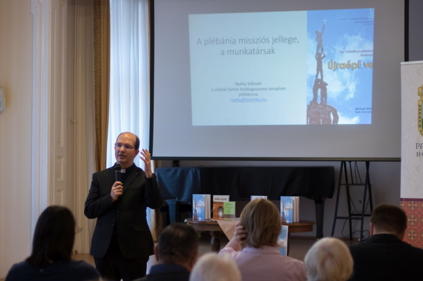 Kondé Lajos pasztorális helynök köszöntőszavai után elsőként Nyéky Kálmán, a siófoki Sarlós Boldogasszony-templom plébánosa tartott előadást: az Újraépítve című könyv kapcsán, személyes példák és tapasztalatok alapján arról beszélt, hogy mit jelent a közösségek megújulása az Egyházban. Az előadó interaktív kérdéssekkel vonta be a hallgatóságot a téma közös átgondolásába.