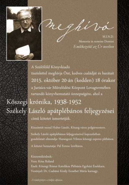 Székely László (Budapest, 1894. dec. 24. – Székesfehérvár, 1991. dec. 27.) apátplébános, teológiai tanár, költő feljegyzései 1938-tól 1952-ig szinte naponta rögzítik a plébánia és a város fontos eseményeit. Ennek köszönhetően az olvasó nyomon követheti egy plébános szemszögéből – „a színfalak mögül” –, hogyan jutott el Kőszeg virágzó katolikus társadalma a nyilas terrort követően a kommunista diktatúrában bekövetkezett összeomlásig.