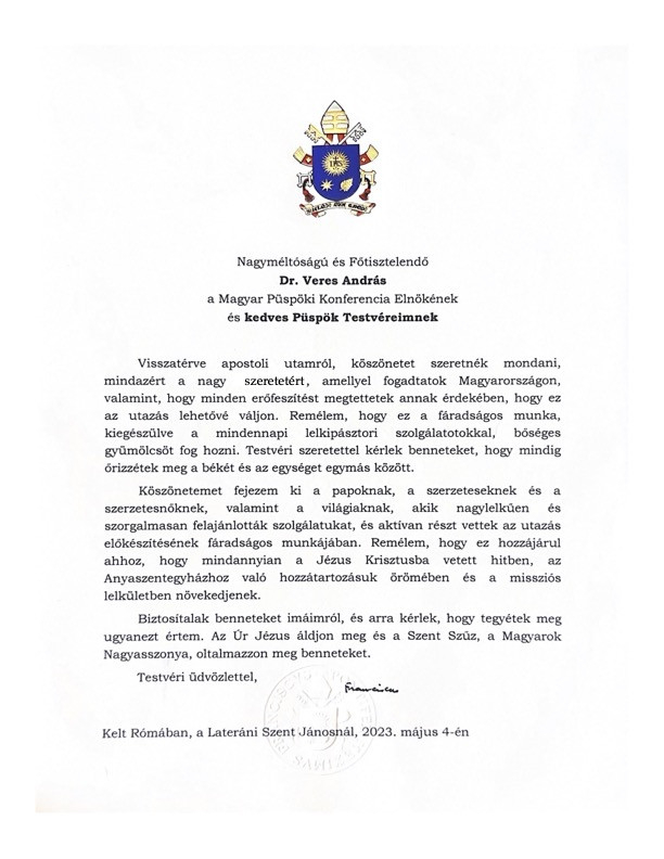 Visszatérve apostoli utamról, köszönetet szeretnék mondani, mindazért a nagy szeretetért, amellyel fogadtatok Magyarországon, valamint, hogy minden erőfeszítést megtettetek annak érdekében, hogy ez az utazás lehetővé váljon. Remélem, hogy ez a fáradságos munka, kiegészülve a mindennapi lelkipásztori szolgálatotokkal, bőséges gyümölcsöt fog hozni. Testvéri szeretettel kérlek benneteket, hogy mindig őrizzétek meg a békét és az egységet egymás között.