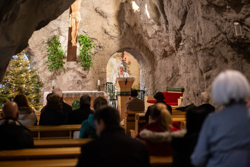 A Szentlelket hívó ének után Komáromi Mária megemlékezett arról, hogy Assisi Szent Ferenc nyolcszáz évvel ezelőtt Greccióban ünnepelte Jézus megszületését, és élő betlehemet állíttatott Európában először. Mint mondta, Celanói Tamás leírja, Szent Ferenc a saját szemeivel akarta látni az alázatosságot, egyszerűséget, szegénységet úgy, ahogyan Betlehemben volt. Az élettelen kisbaba, aki a jászolban volt elhelyezve, egyszer csak felébredt a szent tekintetére, megelevenedett. Az emberek szívében már elaludt az Úr Jézus szeretete – írja magyarázatként Celanói Tamás –, a szent felébresztette. Ébredjen fel a mi szívünkben is Isten szeretete és jelenléte! – biztatott Komáromi Mária.
