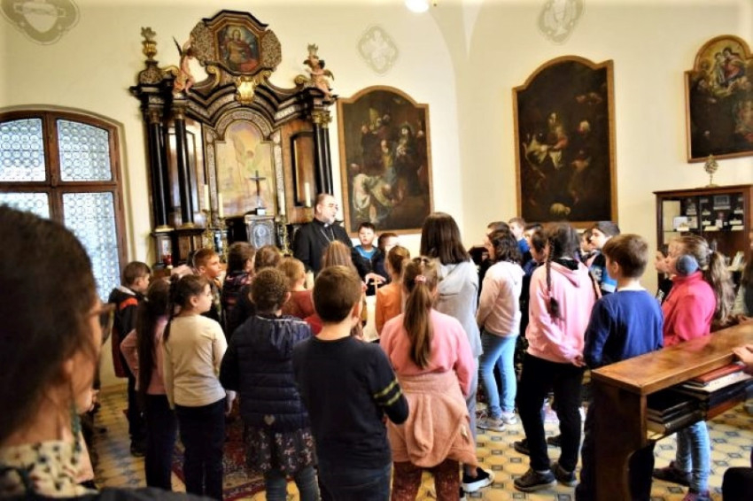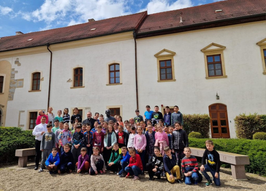 A püspöki arcképcsarnokban a gyerekek rögtön felismerték szülőfalujuk nagy szülöttjének és iskolájuk névadójának portréját.