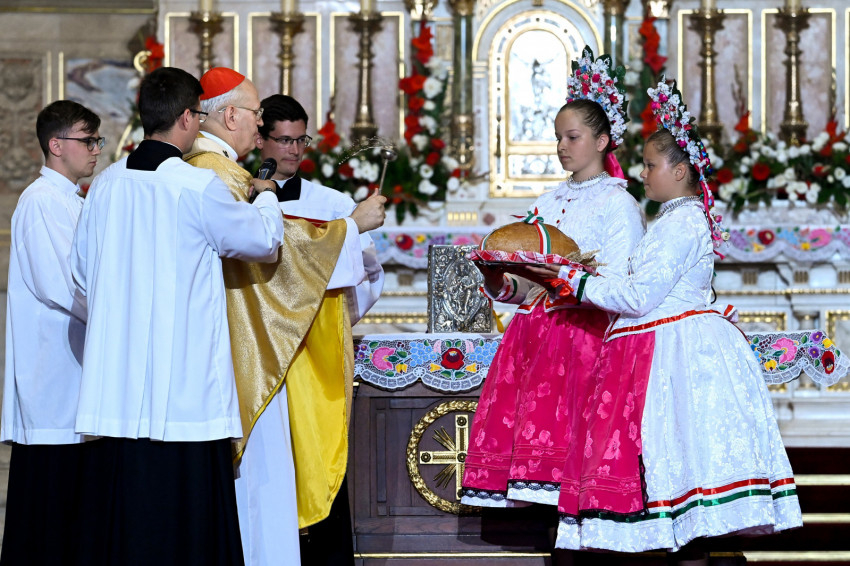 Köszöntője után Erdő Péter megáldotta az új kenyeret, amelyet két, népviseletbe öltözött fiatal leány hozott az oltárhoz.