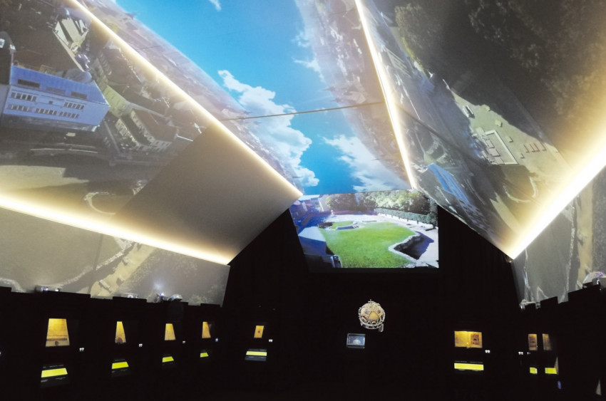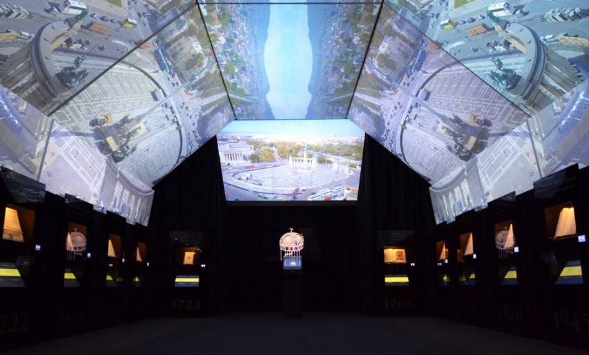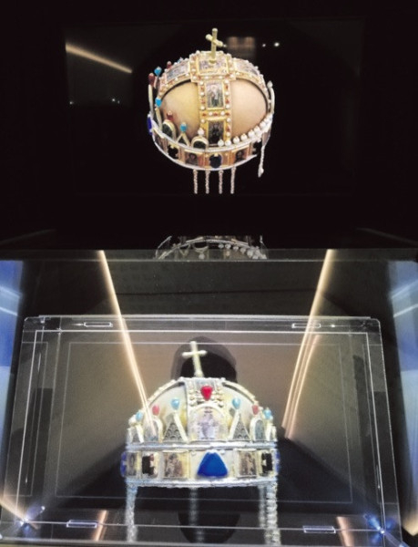 A kiállítóterem hátsó falán a magyar Szent Koronát látjuk forogni egy tévé képernyőjén, a kép tűéles, részletgazdag. Nem messze tőle szintén a korona látható egy hologramos kockába zárva, amely nagyon trükkösen forgatható. Érintésre a korona egyes részletei kinagyíthatók, közelebb hozhatók.