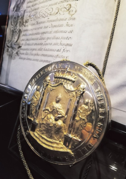 A kiállítás talán legszebb, de mindenképpen legdíszesebb dokumentuma az, amelyiken Mária Terézia eredeti aranypecsétje is szerepel. Az irat a korábbi fejedelemség helyett nagyfejedelemség rangra emeli Erdélyt, ezzel is megerősítve különállását és az ezzel összefüggő jogait. Gyönyörű, erősen barokkos az erdélyi címer, amelyet szintén arannyal festettek meg. Ám a valóságban csak szimbolikus jelentősége volt ennek az iratnak, hiszen Erdélyt ezután is központilag irányították a Habsburg Birodalomból, a bécsi minisztériumokon keresztül, ugyanúgy, mint addig. Az okmány kibocsátása csupán egy gesztus volt Mária Terézia részéről, mivel adó- és határvidékreformjai nagy elégedetlenséget keltettek Erdélyben. A székely határőröket is korlátozták a rendelkezései. Ebben az oklevélben ezért igyekezett megerősíteni Erdély jogait, legalább szimbolikusan.