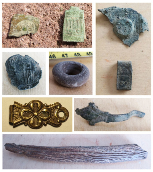 Válogatás az előkerült apróleletekből (könyvveretek és -kapcsok, egy római érem, egy üvegpalack szája, egy vasszerszám agancsnyele)