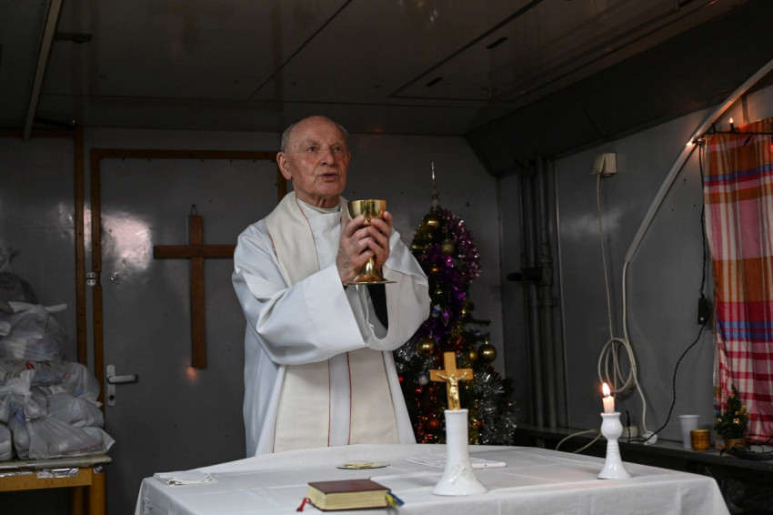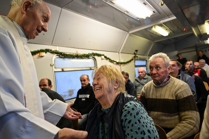 A szentmisét a közösségi helyiségnek kialakított vagonban tartották. Régi ismerősként köszöntötték a lakók Imre atyát.