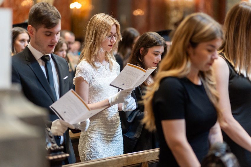 Az ünnepség elején Kuminetz Géza, a PPKE rektora vezetésével a Szent István-bazilika oltára elé vonultak az egyetem és a bölcsészkar vezetői: Szabó István rektorhelyettes, Birher Nándor Máté, a PPKE BTK dékánja, Nemesi Attila László tanulmányi dékánhelyettes, Kőszeghy Miklós tudományos és kutatási dékánhelyettes és Major Balázs külügyi és társadalmi kapcsolatokért felelős dékánhelyettes.