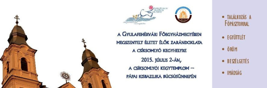 Főegyházmegyénk főpásztorával, Jakubinyi György érsek úrral való egyeztetés után 2015. július 2-án a csíksomlyói kegytemplom, pápai kisbazilika búcsúnapján, Sarlós Boldogasszony ünnepén az erdélyi főegyházmegye területén szolgáló, megszentelt életet élő nővéreket és testvéreket közös zarándoklatra hívjuk.