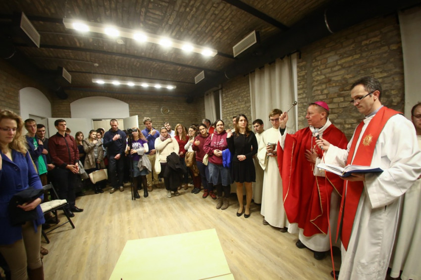Sajgó Szabolcs jezsuita szerzetes, a Párbeszéd Háza igazgatója köszöntötte a közösségi térnek otthont adó intézmény nevében az egybegyűlteket. Kifejezte örömét, hogy megvalósul az együttműködés, és a váci egyházmegyei fiatalok otthonra lelnek a Párbeszéd Házában. Elmondta, hogy párhuzamosan zajlik a házban egy beszélgetés a párizsi eseményekről és kérte az összegyűlt fiatalokat, a szentmisén imádkozzanak a világért, hogy mint a szülési fájdalom után, valami jobb szülessen ebből a nehéz helyzetből.