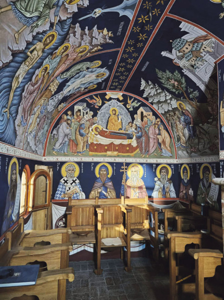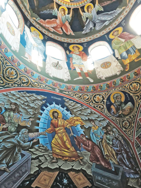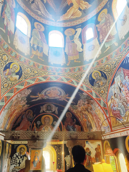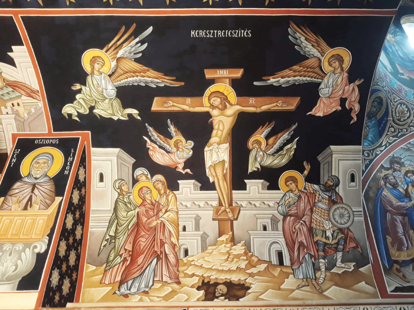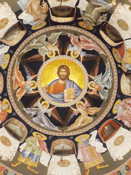 A három méter átmérőjű félgömb kupola középpontjában a Pantokrátor Krisztus látható valódi – füstlemezes – aranyháttérrel. Angyalok tartják a „kaput”, amelyben megjelenik a „mindenható” alakja. Alatta, az ablakok között az ószövetségi próféták jelennek meg, majd folytatódik a teljes ikonográfiai program a szentek soráig, amelyek most nyáron készültek el. Ezzel zárult az ottani munkám, a teljes templombelső kifestése. Az első ottani festményem és egyben a diplomamunkám a Mária elszenderülése volt. Ez a jelenet az ortodox templomokban hagyományosan a bejárat felett kap helyet, a Szent György-hegyi kápolnában viszont a hátsó falra került. E kép különös jelentőséggel bír: