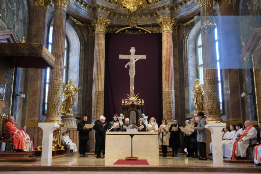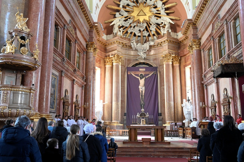 A nagypénteki szertartást Martos Levente Balázs esztergom-budapesti segédpüspök vezette az esztergomi Nagyboldogasszony- és Szent Adalbert-főszékesegyházban.