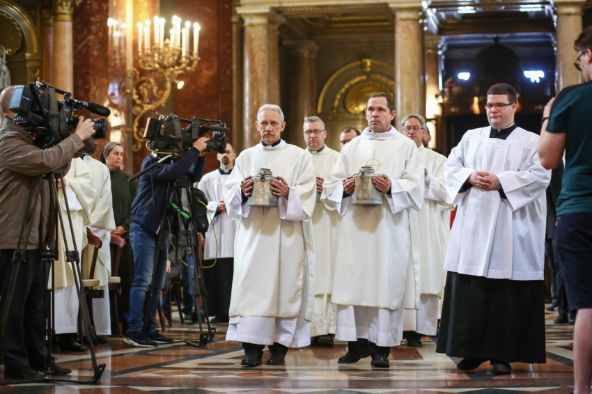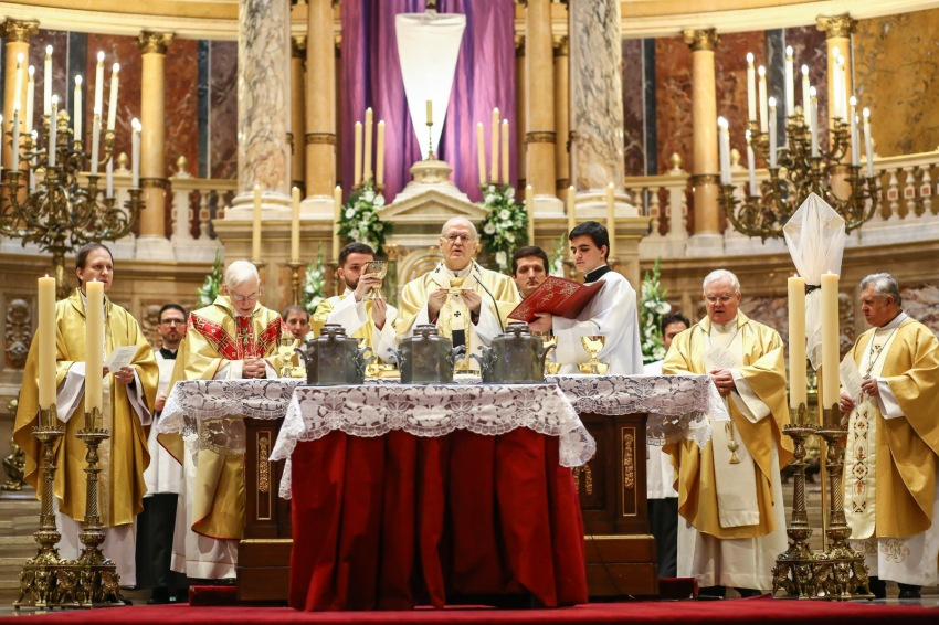 Erdő Péter bíboros, prímás a budapesti Szent István-bazilikában mutatott be krizmaszentelési szentmisét április 18-án, nagycsütörtökön. A hagyományoknak megfelelően a homíliát követően a főegyházmegye lelkipásztorai megújították a felszentelésükkor tett papi ígéreteiket.