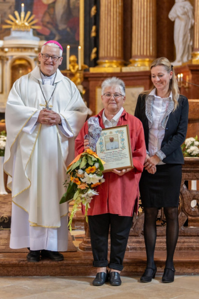 A szentmisében Spányi Antal püspök átadta Nagy Lajosnénak, a Székesfehérvári Egyházmegyei Karitász korábbi vezetőjének sokéves fáradhatatlan szolgálatáért a Szentatya áldását.
