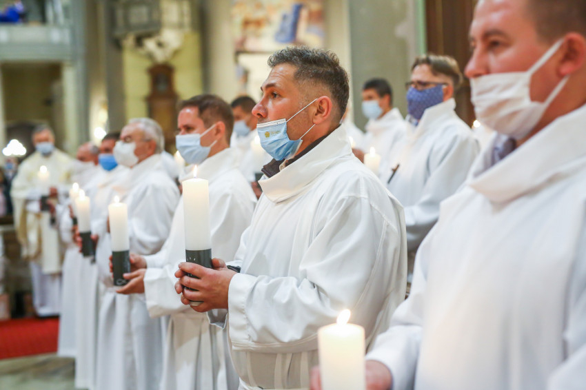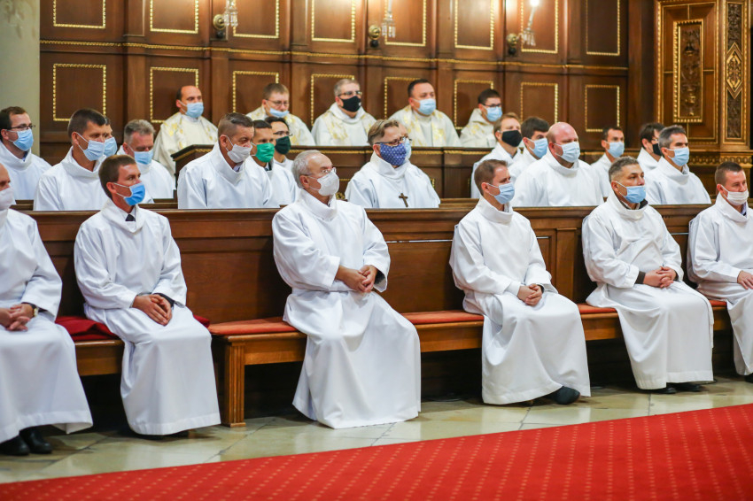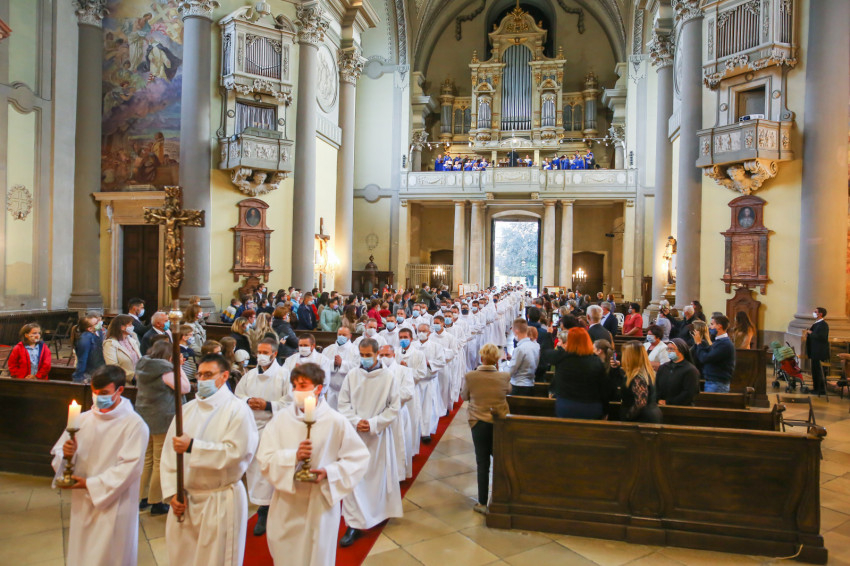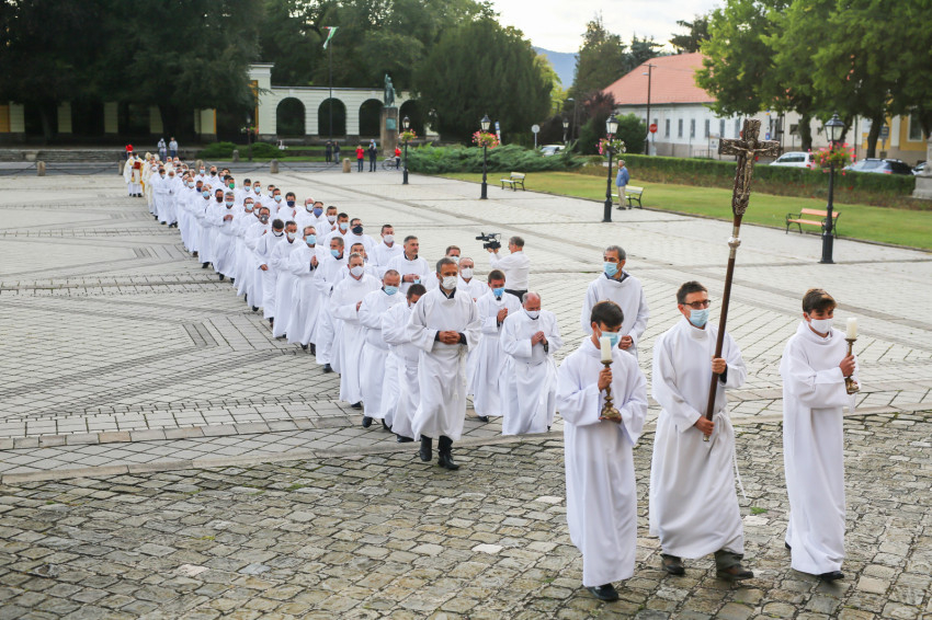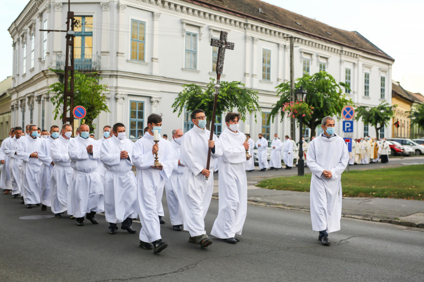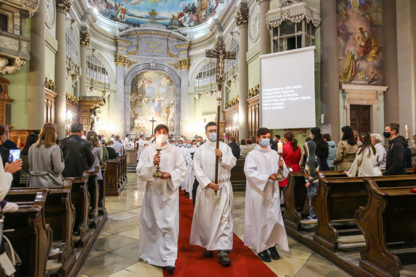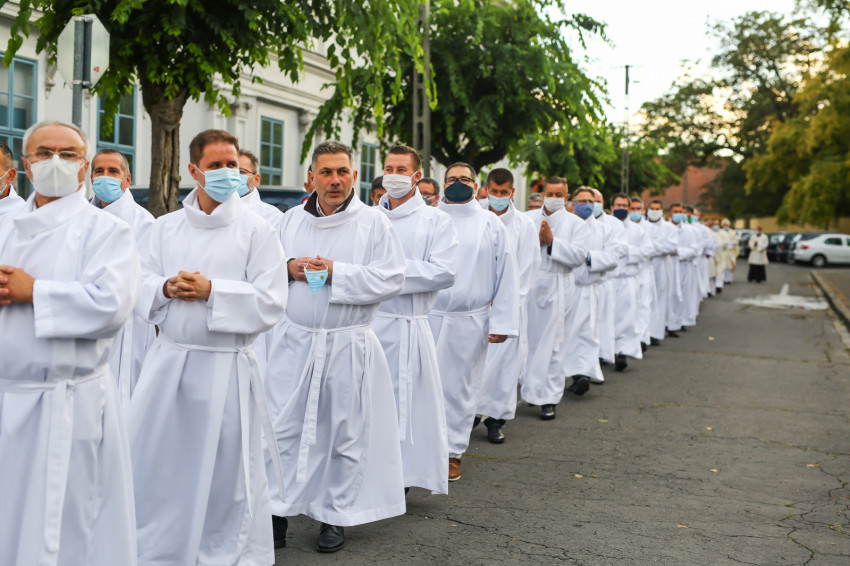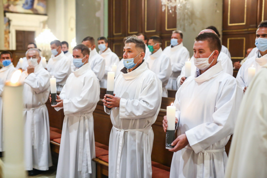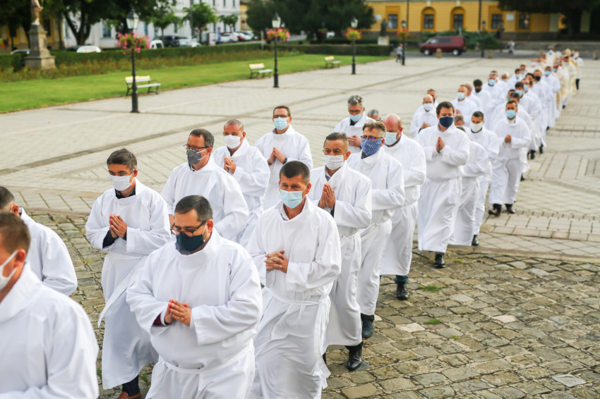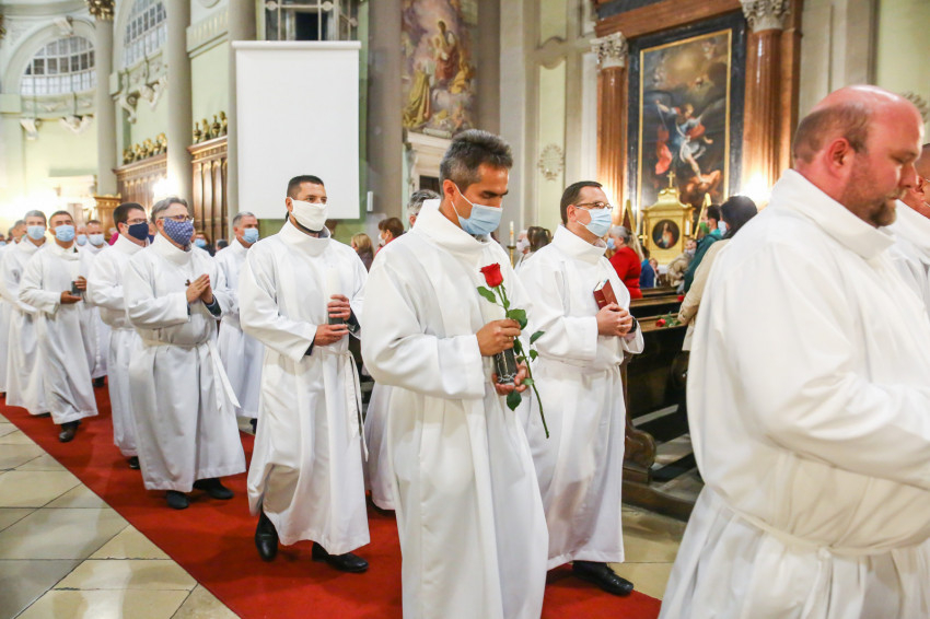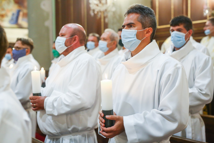 Megszólalt az orgona, felcsendült az ének, elkezdődött a szentmise. Marton Zsolt püspökkel hosszú sorban vonult be az asszisztencia. Felnőtt férfiak serege, diakónusok, lektorok, akolitusok, a negyven avatásra jelentkező, valamint paptestvérek. A szentmisén csak az avatás előtt állók közvetlen hozzátartozói vehettek részt, a járvány miatt ezúttal nem indíthattak buszokat a plébániák.