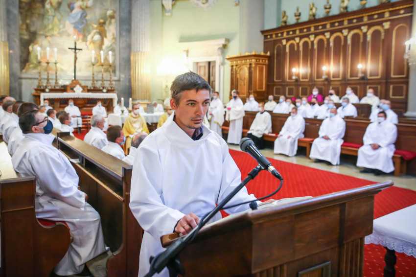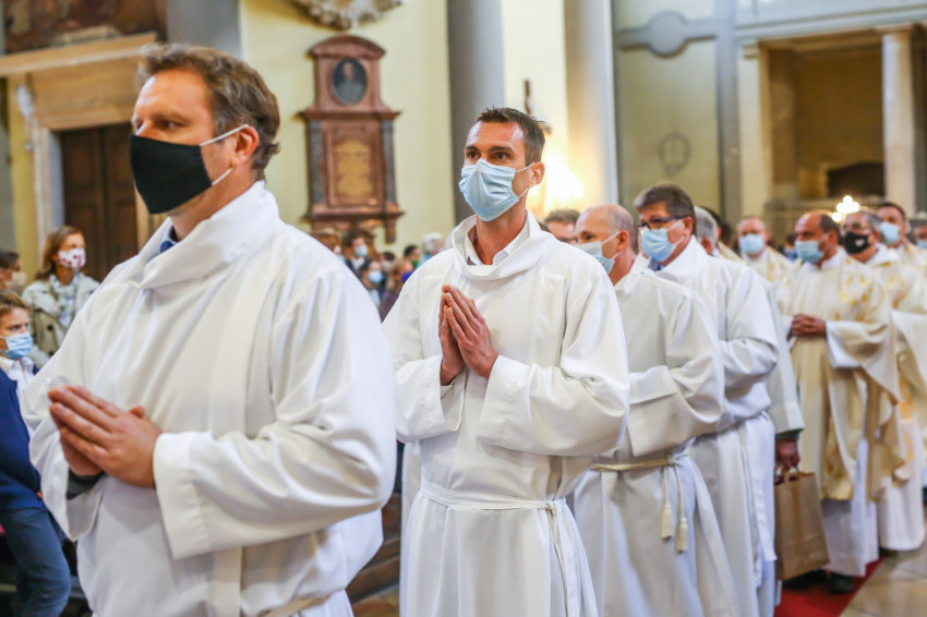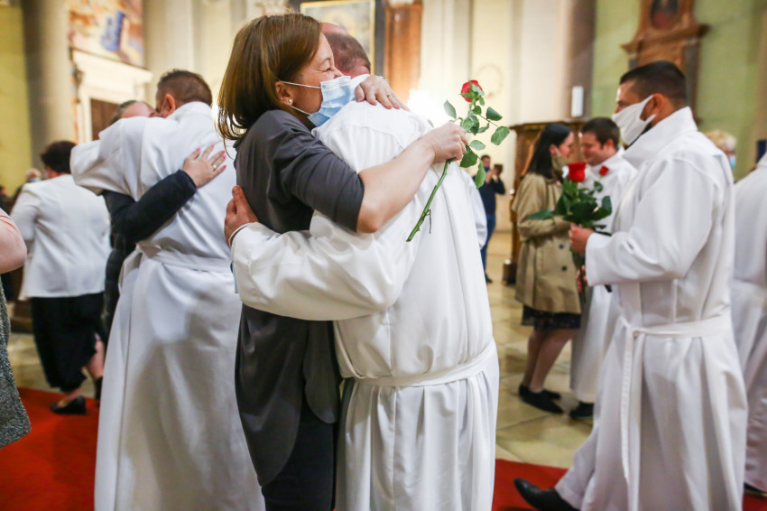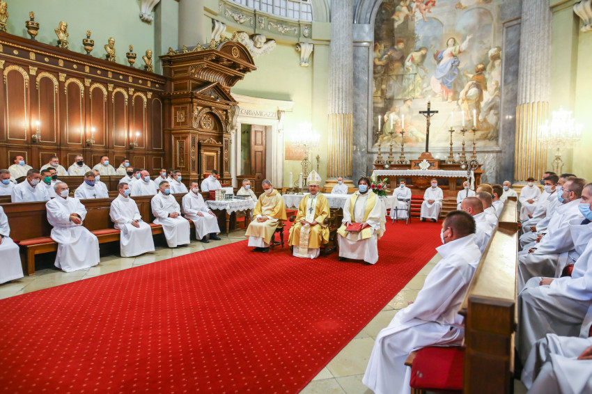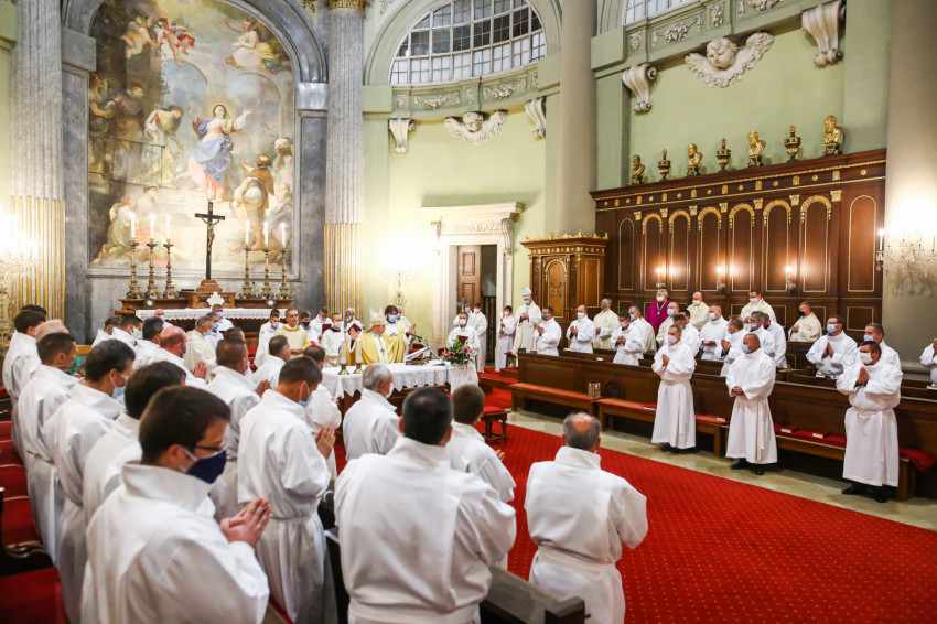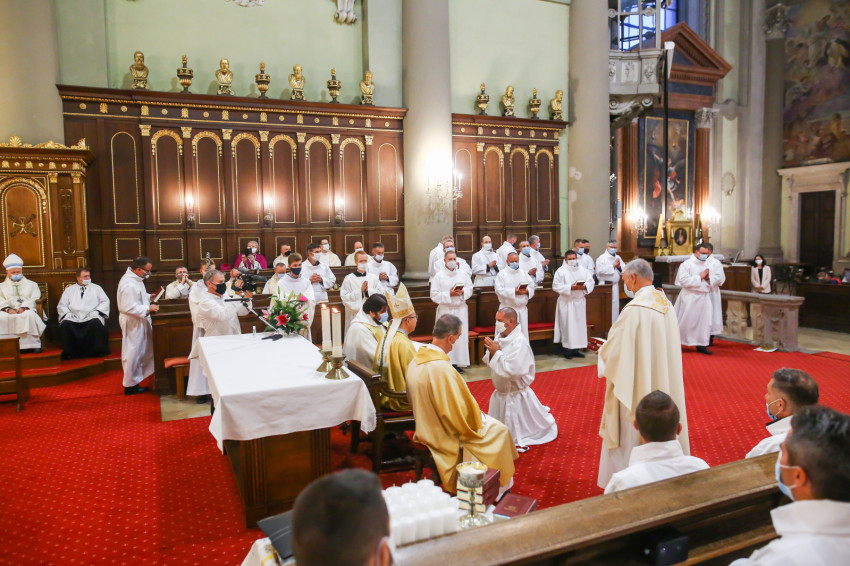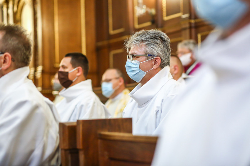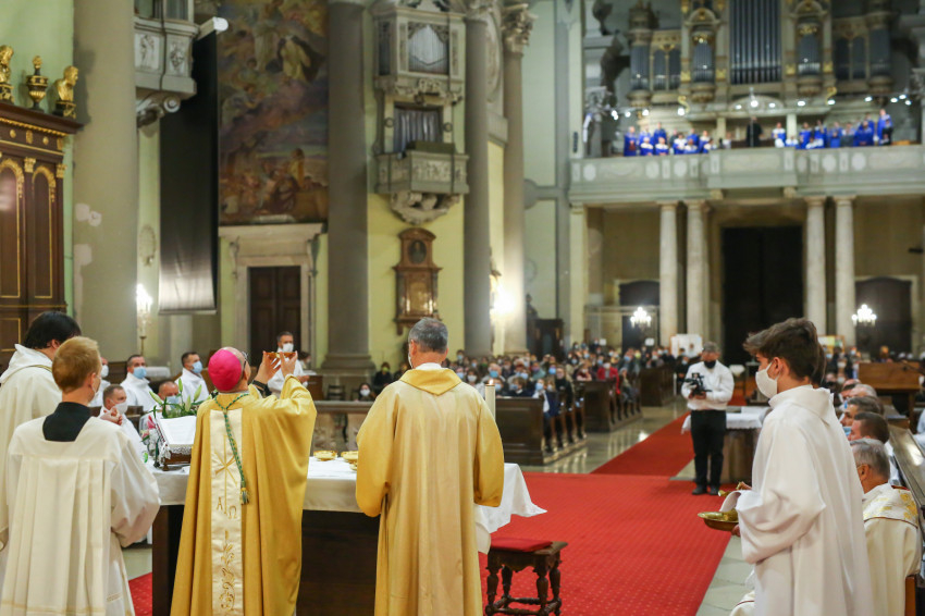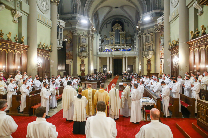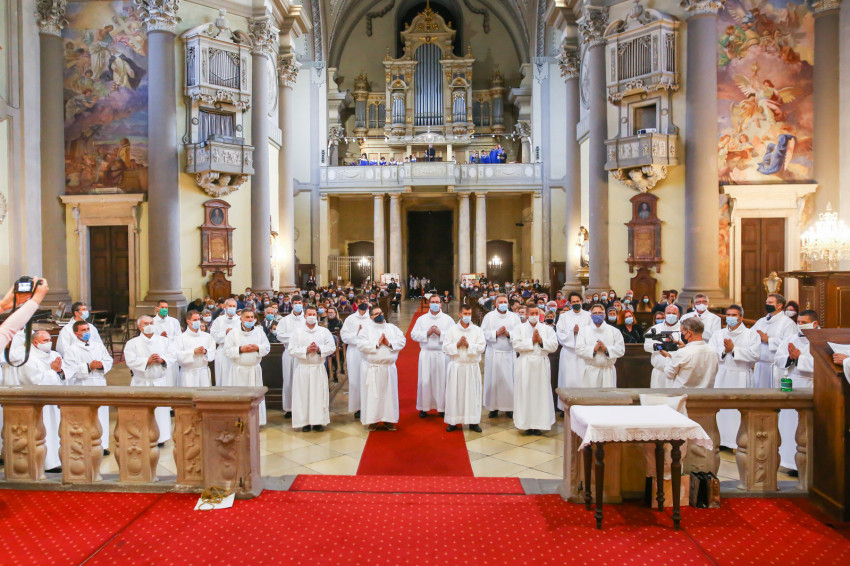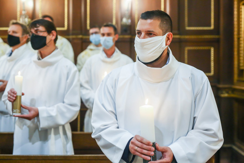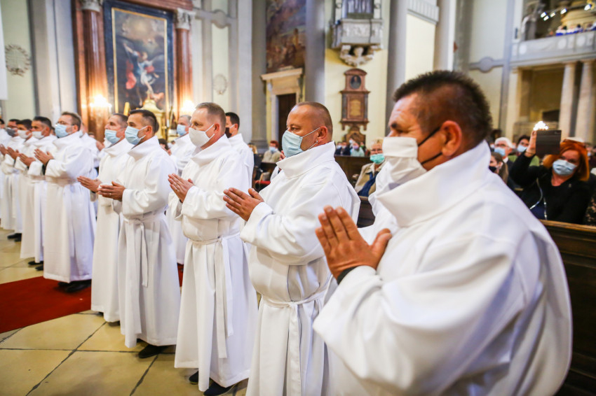 Megszólalt az orgona, felcsendült az ének, elkezdődött a szentmise. Marton Zsolt püspökkel hosszú sorban vonult be az asszisztencia. Felnőtt férfiak serege, diakónusok, lektorok, akolitusok, a negyven avatásra jelentkező, valamint paptestvérek. A szentmisén csak az avatás előtt állók közvetlen hozzátartozói vehettek részt, a járvány miatt ezúttal nem indíthattak buszokat a plébániák.