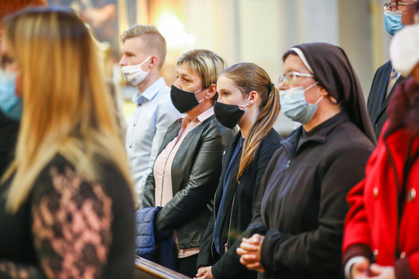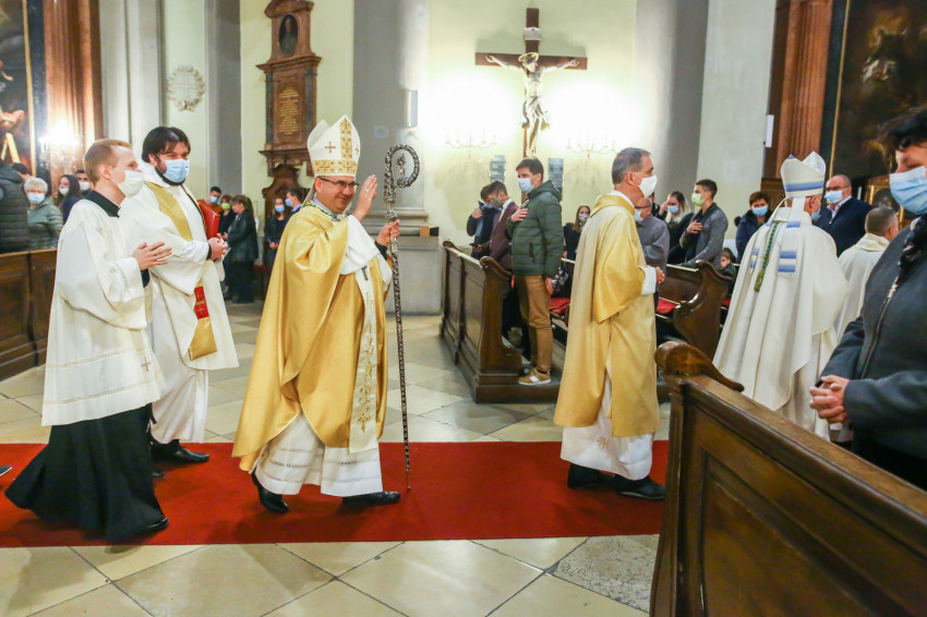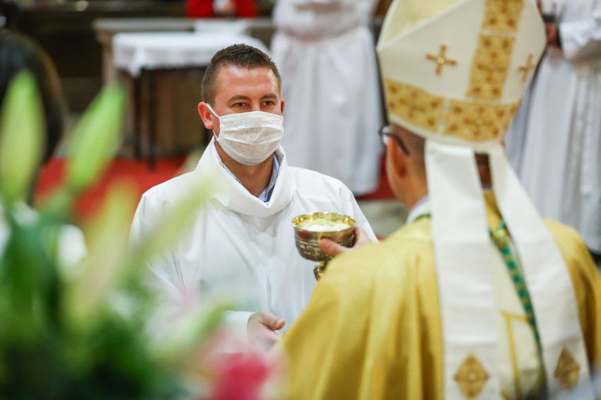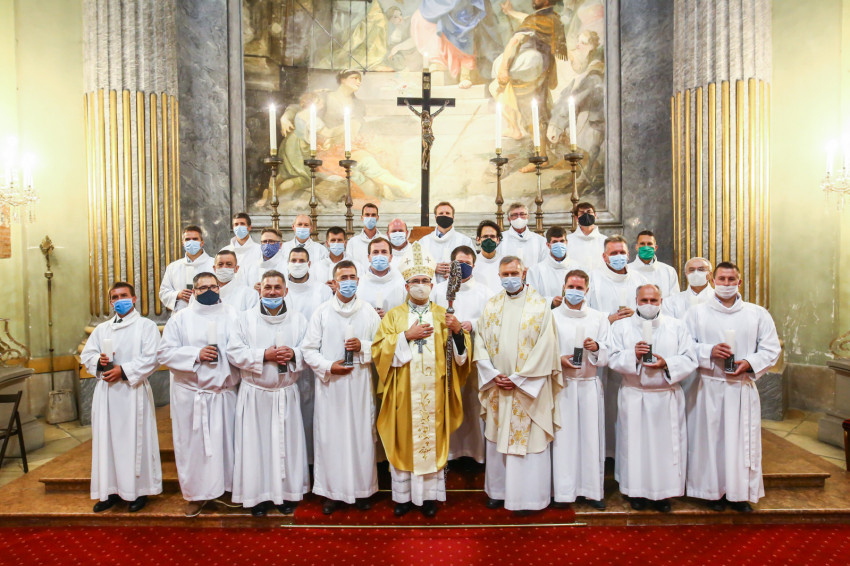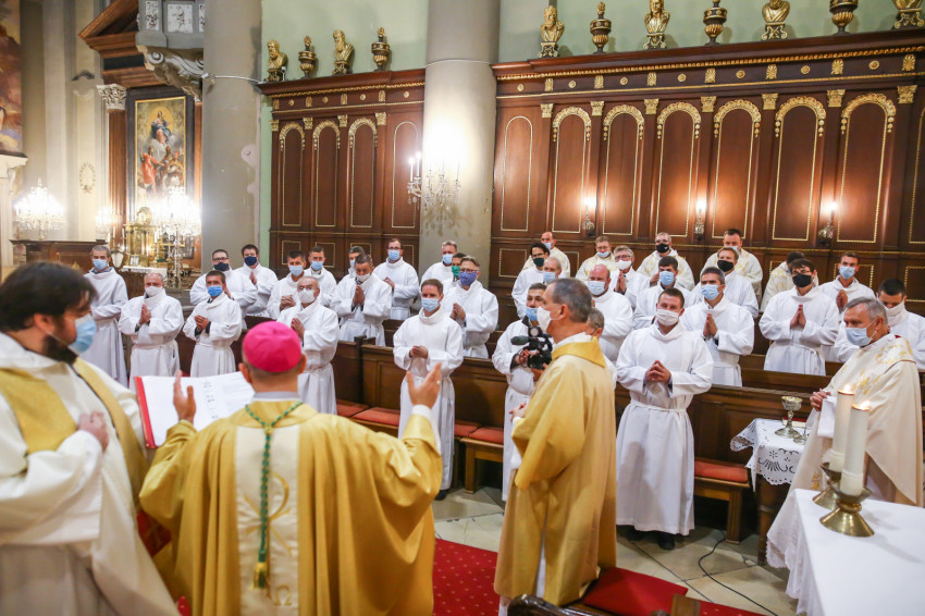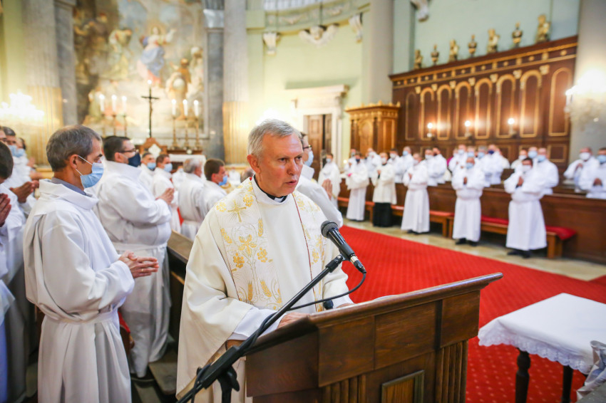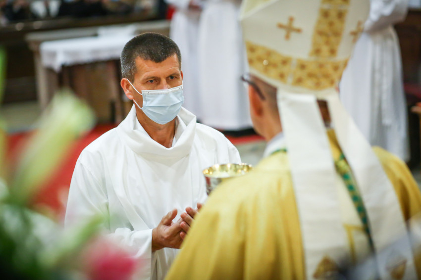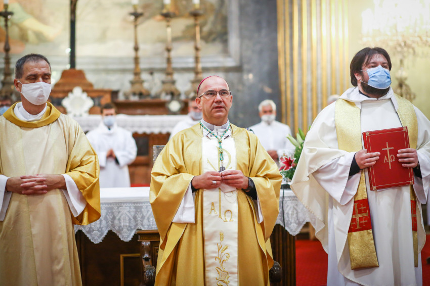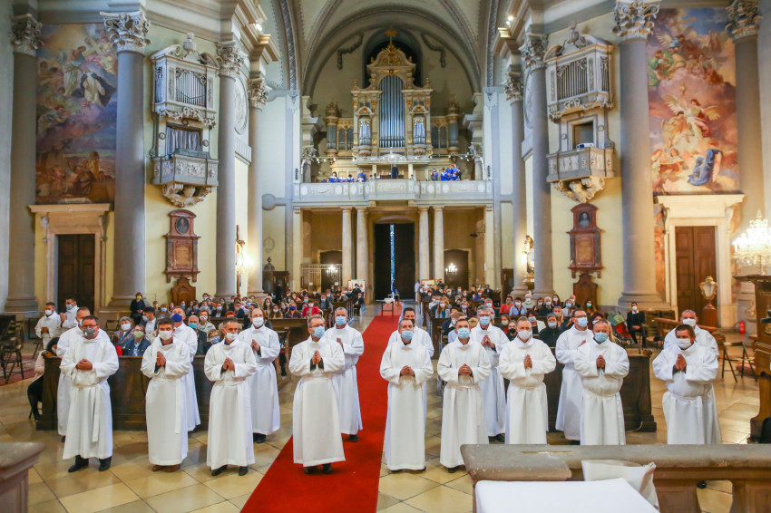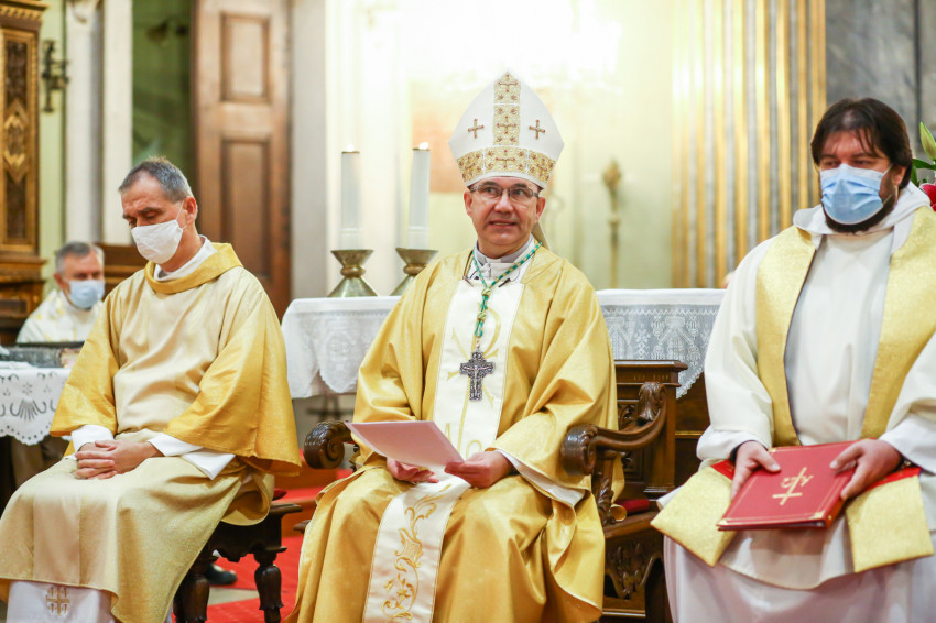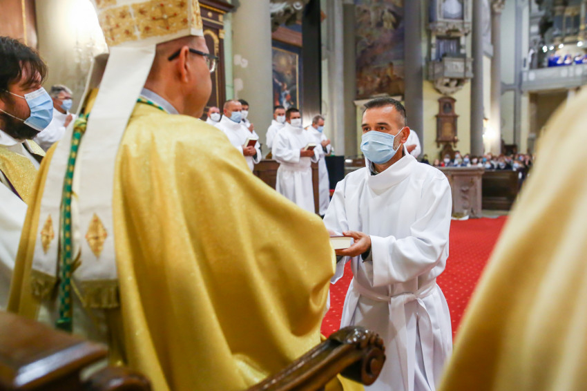 Megszólalt az orgona, felcsendült az ének, elkezdődött a szentmise. Marton Zsolt püspökkel hosszú sorban vonult be az asszisztencia. Felnőtt férfiak serege, diakónusok, lektorok, akolitusok, a negyven avatásra jelentkező, valamint paptestvérek. A szentmisén csak az avatás előtt állók közvetlen hozzátartozói vehettek részt, a járvány miatt ezúttal nem indíthattak buszokat a plébániák.