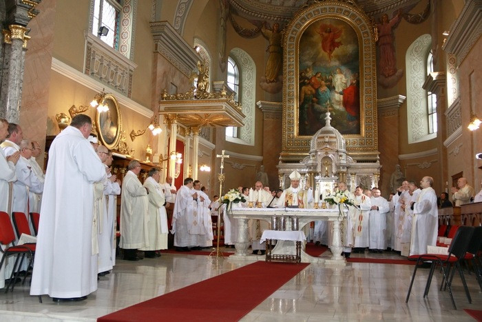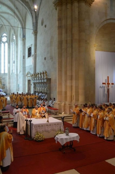Az egyházmegye csaknem minden papja jelen volt a székesegyházban közösen bemutatott szentmisén. Homíliájában Schönberger Jenő püspök arra buzdította papjait, hogy teljes odaadással éljék hivatásukat. Majd kiemelte: a papi élet gyökerében közösségi jellegű, identitása szerint szentháromságos, küldetése az emberekhez szól.