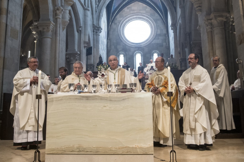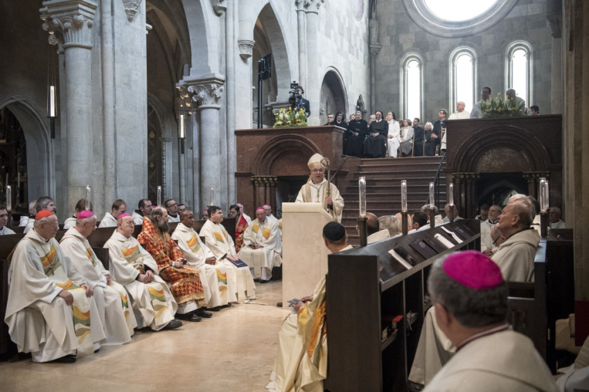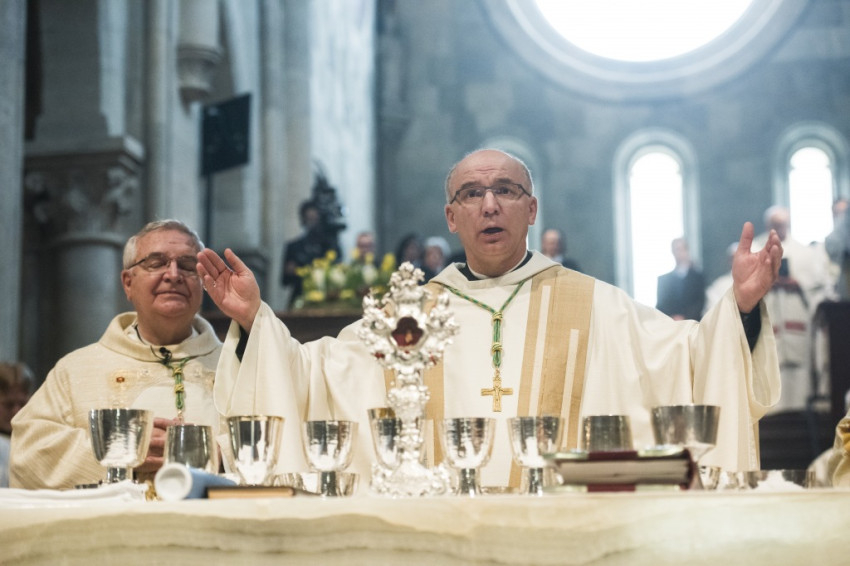 A szentmisén koncelebrált Erdő Péter bíboros, prímás; Germano Penemote, az Apostoli Nunciatúra ügyvivője; az MKPK jelen lévő tagjai, több határon túlról érkezett magyar és más nemzetiségű püspök, bencés és premontrei apátok, illetve más magyarországi szerzetesrendek képviselői. A szertartáson részt vett Sólyom László volt köztársasági elnök, Semjén Zsolt miniszterelnök-helyettes, Sulyok Tamás, az Alkotmánybírság elnöke, Soltész Miklós egyházi, nemzetiségi és civil társadalmi kapcsolatokért felelős államtitkár; az állami és civil élet és a testvéregyházak, valamint a női szerzetesrendek képviselői. A helyhiány miatt sokan a bazilika könyvtárában követték nyomon kivetítőn az eseményeket.