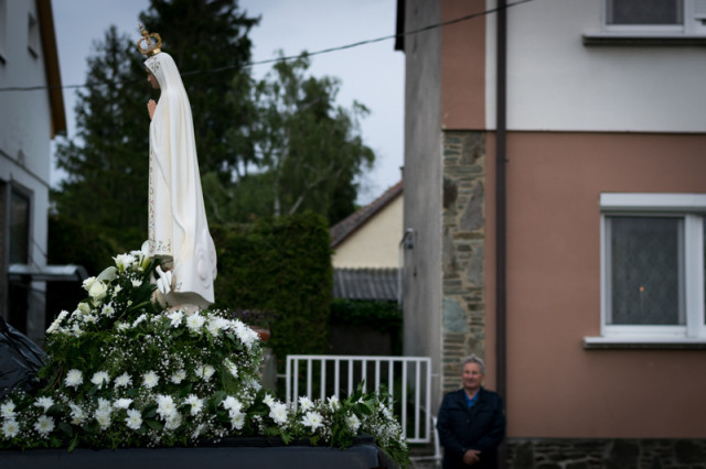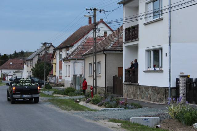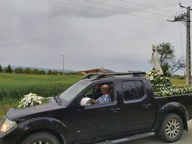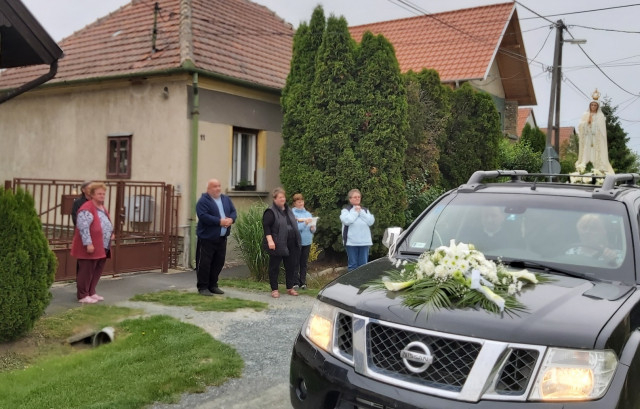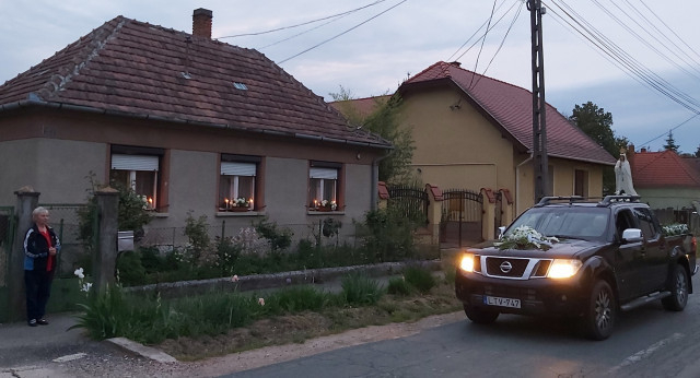 A Szűzanya szobrát egy terepjáróra rögzítve vitte el a plébániához tartozó négy község minden lakójához. Az utcákat végigjárva az autóból égi Édesanyánkat köszöntő énekek szóltak. A hívek házaik ablakait feldíszítve, az utcán állva üdvözölték a nehéz időkben is őket segítő Szűzanyát.