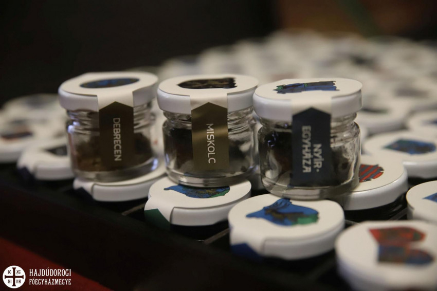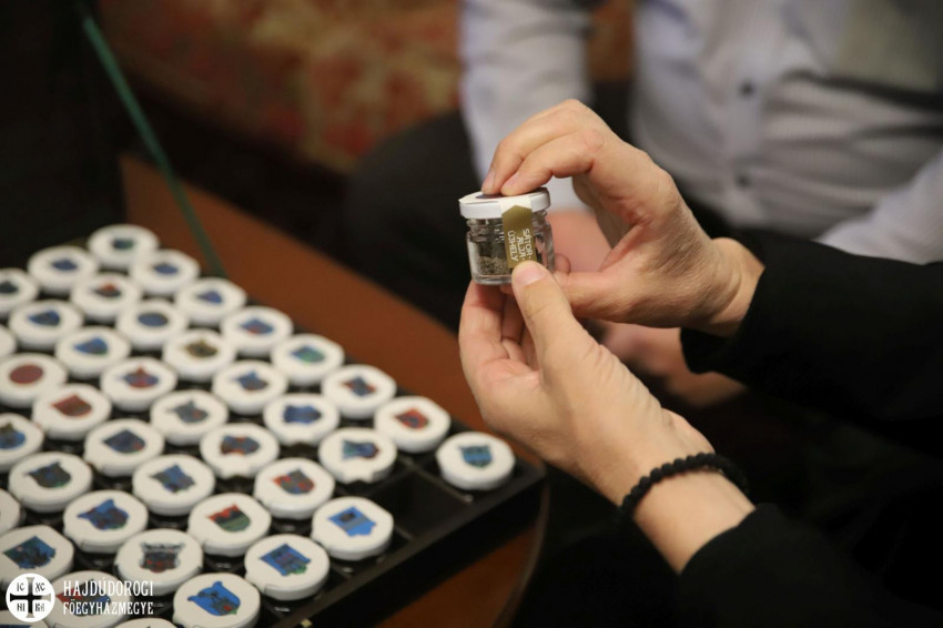 Mártha Tibor idén a nemzeti összetartozás kifejezésére egészen különleges megoldást választott: mindenkit arra biztatott, hogy a történelmi Magyarország megyeszékhelyeiről vigyenek egy maréknyi földet neki, amiket aztán címerezett kis üvegcsékbe rendezett kollégáival.